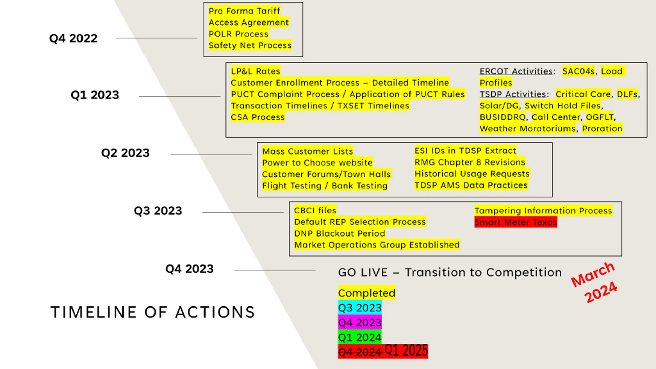 Pro Forma Tariff Access Agreement POLR Process Safety Net Process Q4 2022 LP&L Rates Customer Enrollment Process Detailed Timeline PUCT Complaint Process / Application of PUCT Rules Transaction Timelines / TXSET Timelines CSA Process ERCOT Activities: SAC04s, Load Profiles TSDP Activities: Critical Care, DLFs, Solar/DG, Switch Hold Files, BUSIDDRQ, Call Center, OGFLT, Weather Moratoriums, Proration Q1 2023 Q2 2023 ESI IDs in TDSP Extract RMG Chapter 8 Revisions Historical Usage Requests TDSP AMS Data Practices Mass Customer Lists Power to Choose website Customer Forums/Town Halls Flight Testing / Bank Testing Q3 2023 CBCI files Default REP Selection Process DNP Blackout Period Market Operations Group Established Tampering Information Process Smart Meter Texas Q4 2023 GO LIVE Transition to Competition Completed Q3 2023 Q4 2023 Q1 2024 Q4 2024 TIMELINE OF ACTIONS