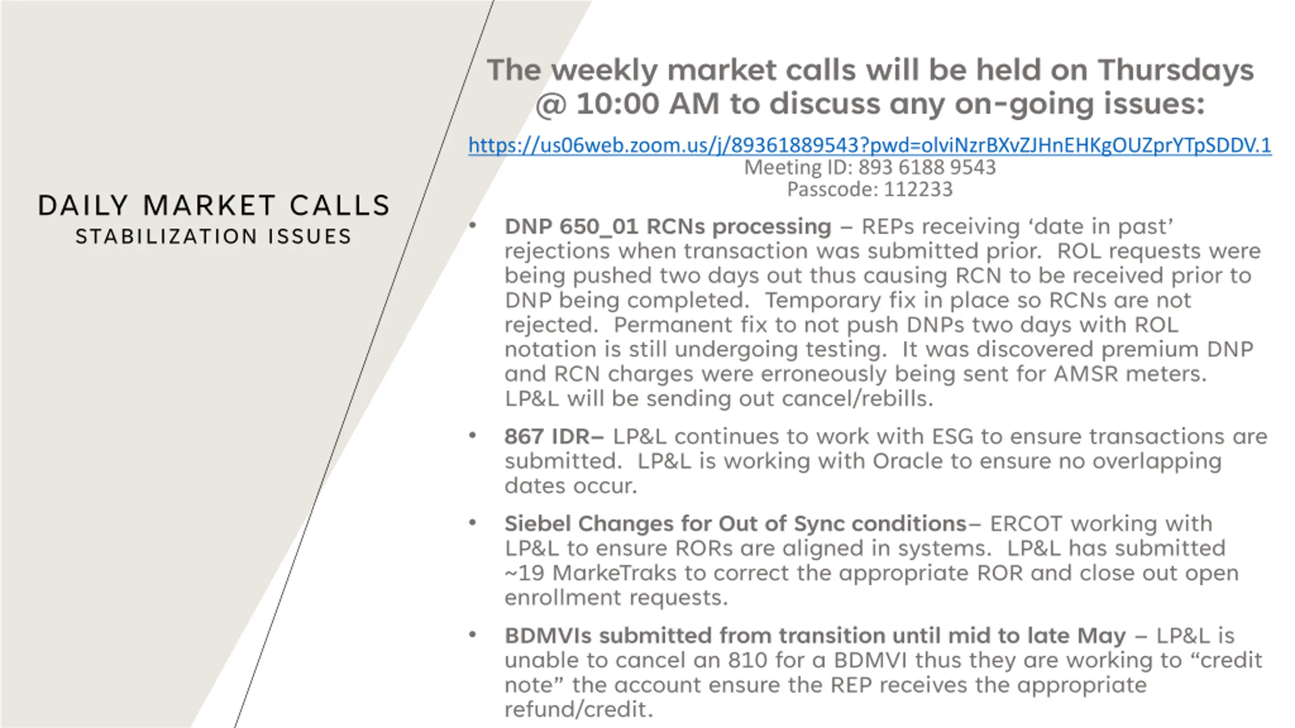 The weekly market calls will be held on Thursdays @ 10:00 AM to discuss any on-going issues: https://us06web.zoom.us/j/89361889543?pwd=olviNzrBXvZJHnEHKgOUZprYTpSDDV.1 Meeting ID: 893 6188 9543 Passcode: 112233 DNP 650_01 RCNs processing REPs receiving date in past rejections when transaction was submitted prior. ROL requests were being pushed two days out thus causing RCN to be received prior to DNP being completed. Temporary fix in place so RCNs are not rejected. Permanent fix to not push DNPs two days with ROL notation is still undergoing testing. It was discovered premium DNP and RCN charges were erroneously being sent for AMSR meters. LP&L will be sending out cancel/rebills. 867 IDR LP&L continues to work with ESG to ensure transactions are submitted. LP&L is working with Oracle to ensure no overlapping dates occur. Siebel Changes for Out of Sync conditions ERCOT working with LP&L to ensure RORs are aligned in systems. LP&L has submitted ~19 MarkeTraks to correct the appropriate ROR and close out open enrollment requests. BDMVIs submitted from transition until mid to late May LP&L is unable to cancel an 810 for a BDMVI thus they are working to credit note the account ensure the REP receives the appropriate refund/credit. DAILY MARKET CALLS STABILIZATION ISSUES