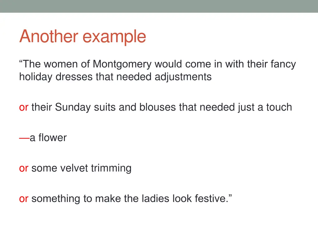 Another example The women of Montgomery would come in with their fancy holiday dresses that needed adjustments or The women of Montgomery would come in with their Sunday suits and blouses that needed just a touch a flower or some velvet trimming or something to make the ladies look festive.