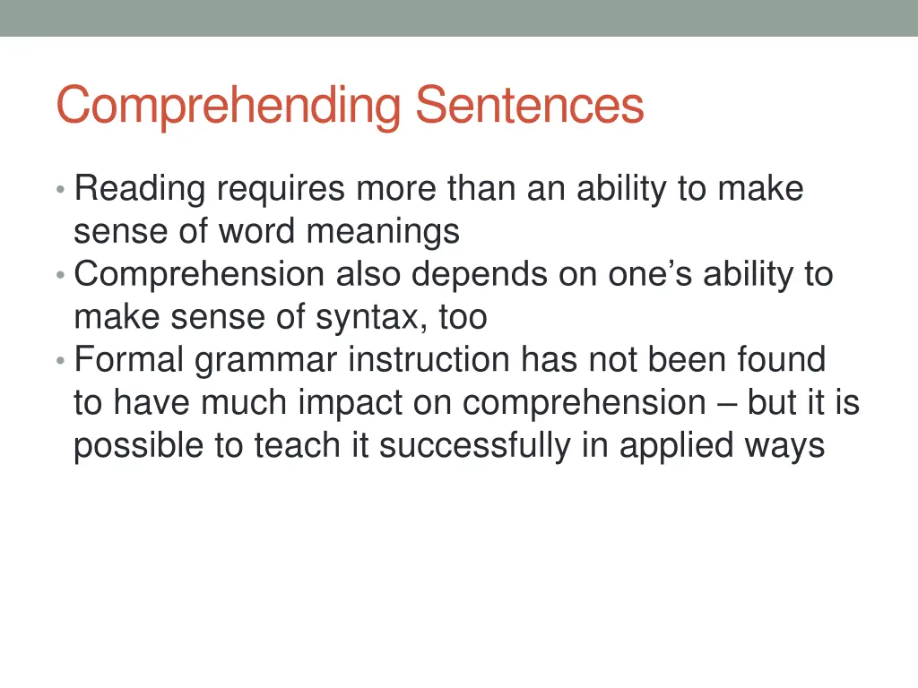 Comprehending Sentences Reading requires more than an ability to make sense of word meanings Comprehension also depends on one s ability to make sense of syntax, too Formal grammar instruction has not been found to have much impact on comprehension but it is possible to teach it successfully in applied ways