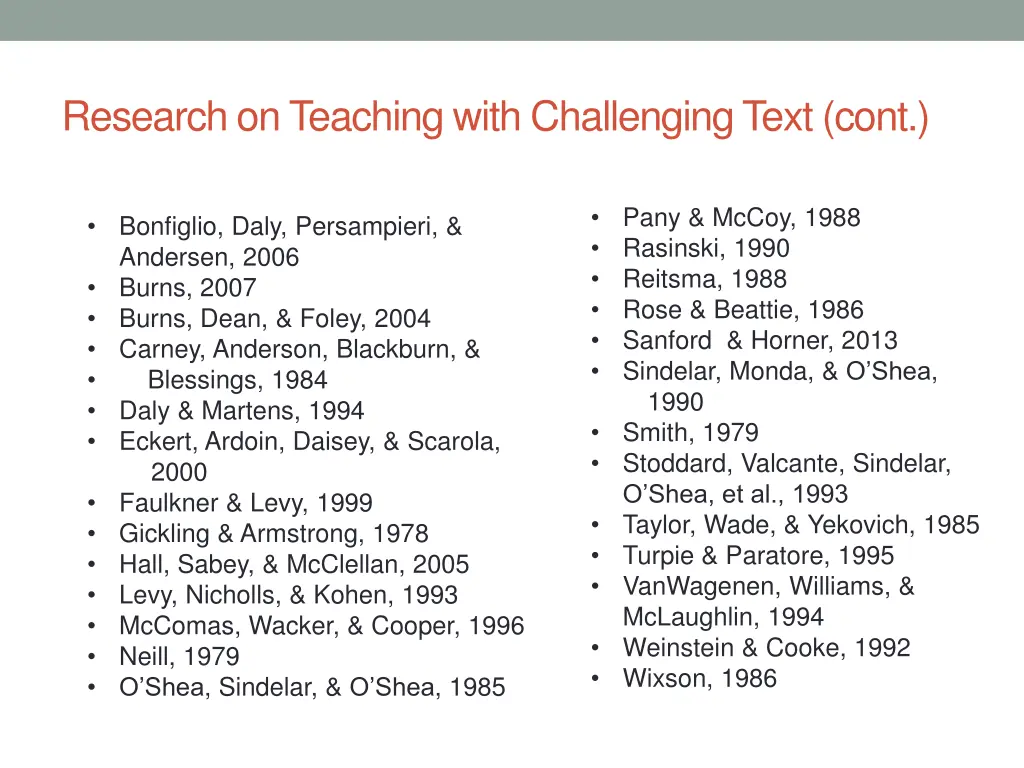 Research on Teaching with Challenging Text (cont.) Pany & McCoy, 1988 Rasinski, 1990 Reitsma, 1988 Rose & Beattie, 1986 Sanford & Horner, 2013 Sindelar, Monda, & O Shea, 1990 Smith, 1979 Stoddard, Valcante, Sindelar, O Shea, et al., 1993 Taylor, Wade, & Yekovich, 1985 Turpie & Paratore, 1995 VanWagenen, Williams, & McLaughlin, 1994 Weinstein & Cooke, 1992 Wixson, 1986 Bonfiglio, Daly, Persampieri, & Andersen, 2006 Burns, 2007 Burns, Dean, & Foley, 2004 Carney, Anderson, Blackburn, & Blessings, 1984 Daly & Martens, 1994 Eckert, Ardoin, Daisey, & Scarola, 2000 Faulkner & Levy, 1999 Gickling & Armstrong, 1978 Hall, Sabey, & McClellan, 2005 Levy, Nicholls, & Kohen, 1993 McComas, Wacker, & Cooper, 1996 Neill, 1979 O Shea, Sindelar, & O Shea, 1985
