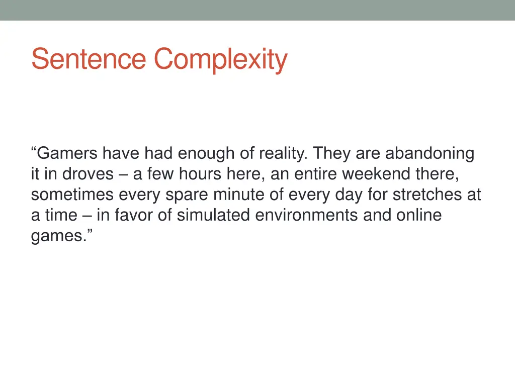Sentence Complexity Gamers [They] are abandoning reality [it] in droves a few hours here, an entire weekend there, sometimes every spare minute of every day for stretches at a time in favor of simulated environments and online games. a few hours here an entire weekend there Sometimes every spare minute of every day for stretches at a time