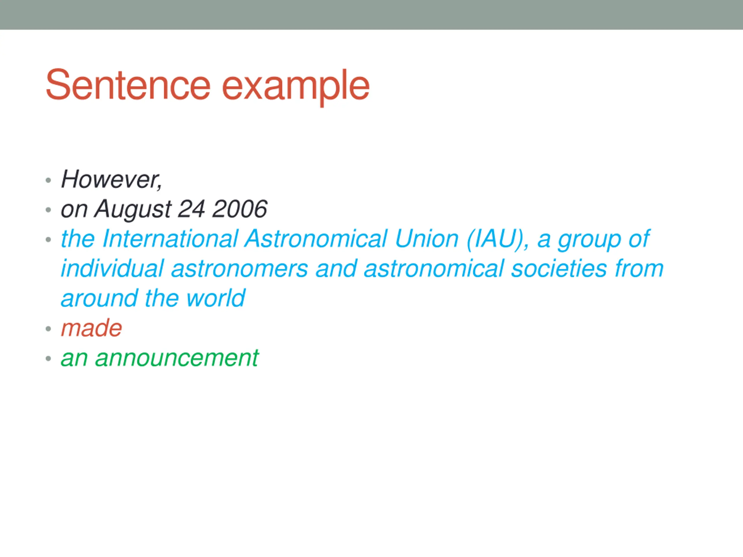 Sentence example Who was the sentence about? the International Astronomical Union (IAU) Who are they? a group of individual astronomers and astronomical societies from around the world What did they do? made Made what? an announcement When? on August 24 2006