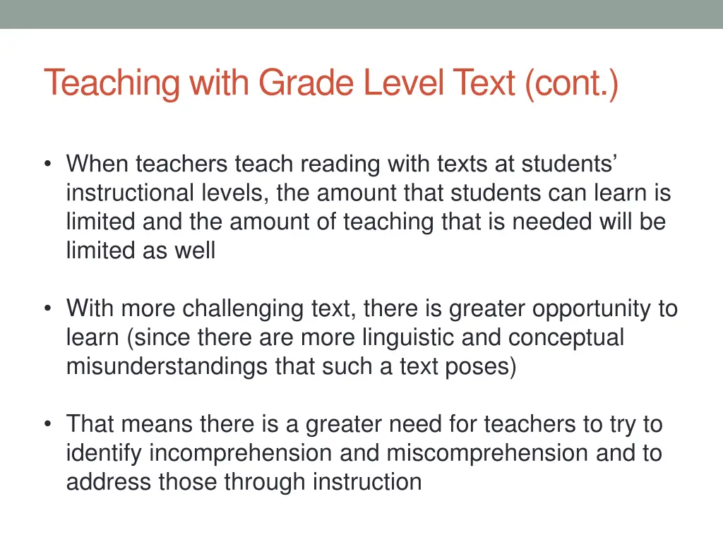 Teaching with Grade Level Text (cont.) When teachers teach reading with texts at students instructional levels, the amount that students can learn is limited and the amount of teaching that is needed will be limited as well With more challenging text, there is greater opportunity to learn (since there are more linguistic and conceptual misunderstandings that such a text poses) That means there is a greater need for teachers to try to identify incomprehension and miscomprehension and to address those through instruction