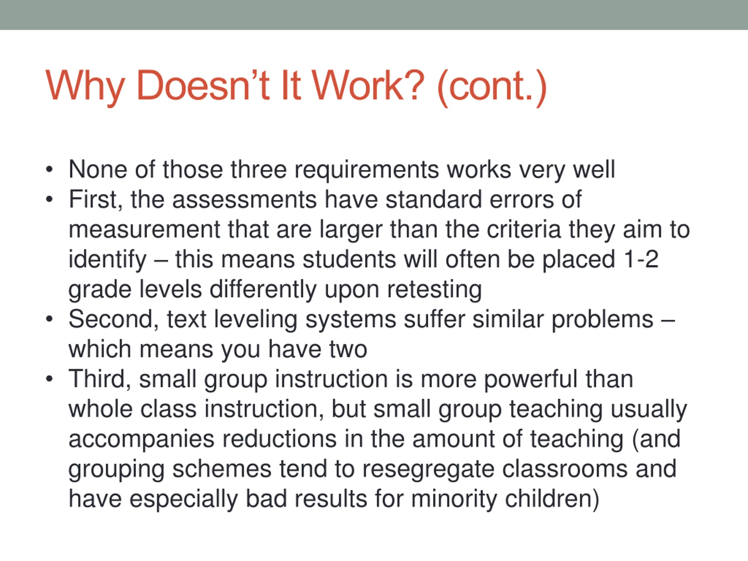 Why Doesnt It Work? (cont.) None of those three requirements works very well First, the assessments have standard errors of measurement that are larger than the criteria they aim to identify this means students will often be placed 1-2 grade levels differently upon retesting Second, text leveling systems suffer similar problems which means you have two Third, small group instruction is more powerful than whole class instruction, but small group teaching usually accompanies reductions in the amount of teaching (and grouping schemes tend to resegregate classrooms and have especially bad results for minority children)