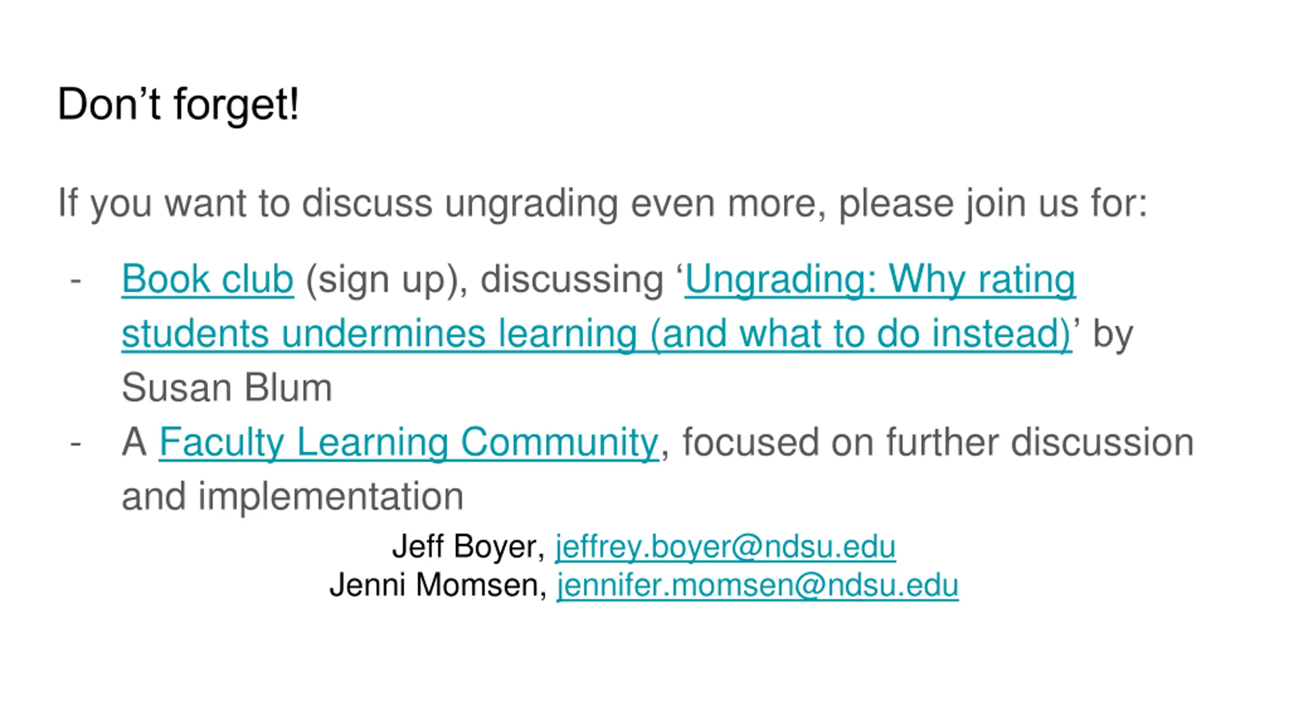Dont forget! If you want to discuss ungrading even more, please join us for: - Book club (sign up), discussing Ungrading: Why rating students undermines learning (and what to do instead) by Susan Blum A Faculty Learning Community, focused on further discussion and implementation Jeff Boyer, jeffrey.boyer@ndsu.edu Jenni Momsen, jennifer.momsen@ndsu.edu -