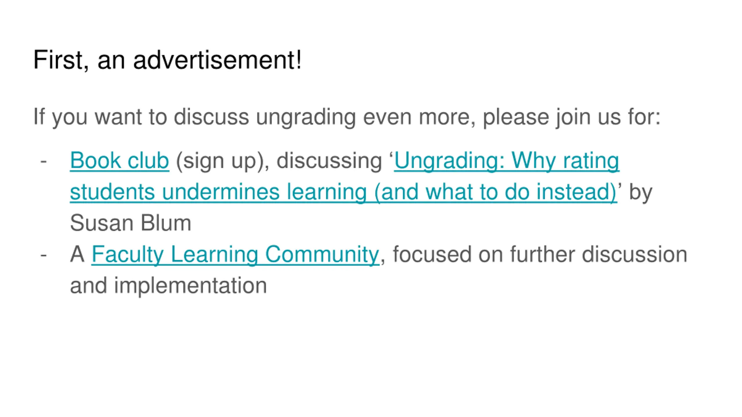 First, an advertisement! If you want to discuss ungrading even more, please join us for: - Book club (sign up), discussing Ungrading: Why rating students undermines learning (and what to do instead) by Susan Blum A Faculty Learning Community, focused on further discussion and implementation -