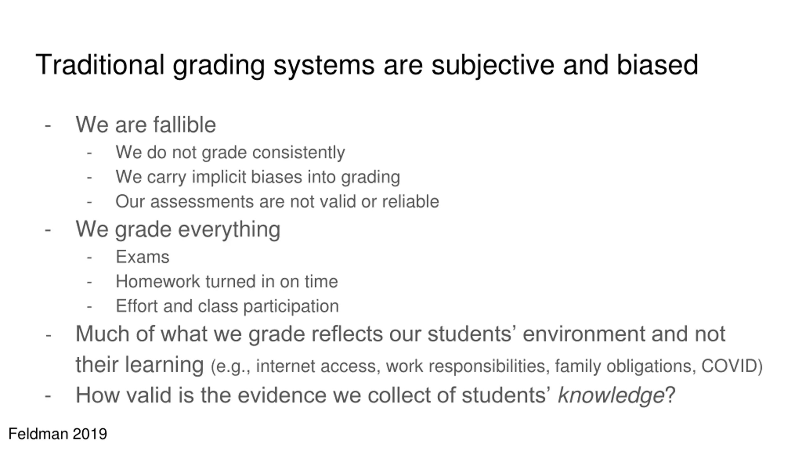 Traditional grading systems are subjective and biased - We are fallible - We do not grade consistently - We carry implicit biases into grading - Our assessments are not valid or reliable We grade everything - Exams - Homework turned in on time - Effort and class participation Much of what we grade reflects our students environment and not their learning (e.g., internet access, work responsibilities, family obligations, COVID) How valid is the evidence we collect of students knowledge? - - - Feldman 2019