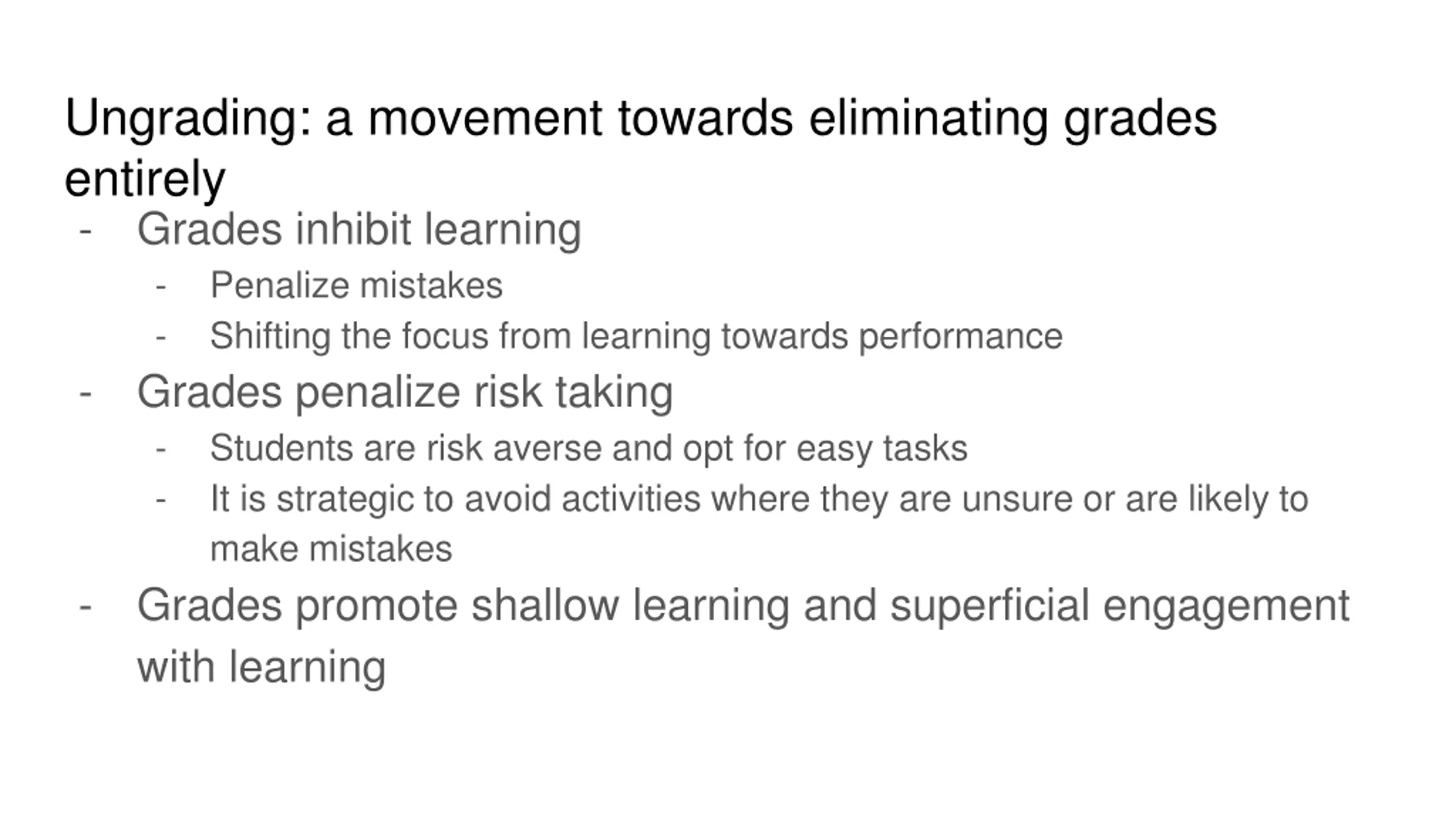 Ungrading: a movement towards eliminating grades entirely - Grades inhibit learning - Penalize mistakes - Shifting the focus from learning towards performance - Grades penalize risk taking - Students are risk averse and opt for easy tasks - It is strategic to avoid activities where they are unsure or are likely to make mistakes - Grades promote shallow learning and superficial engagement with learning