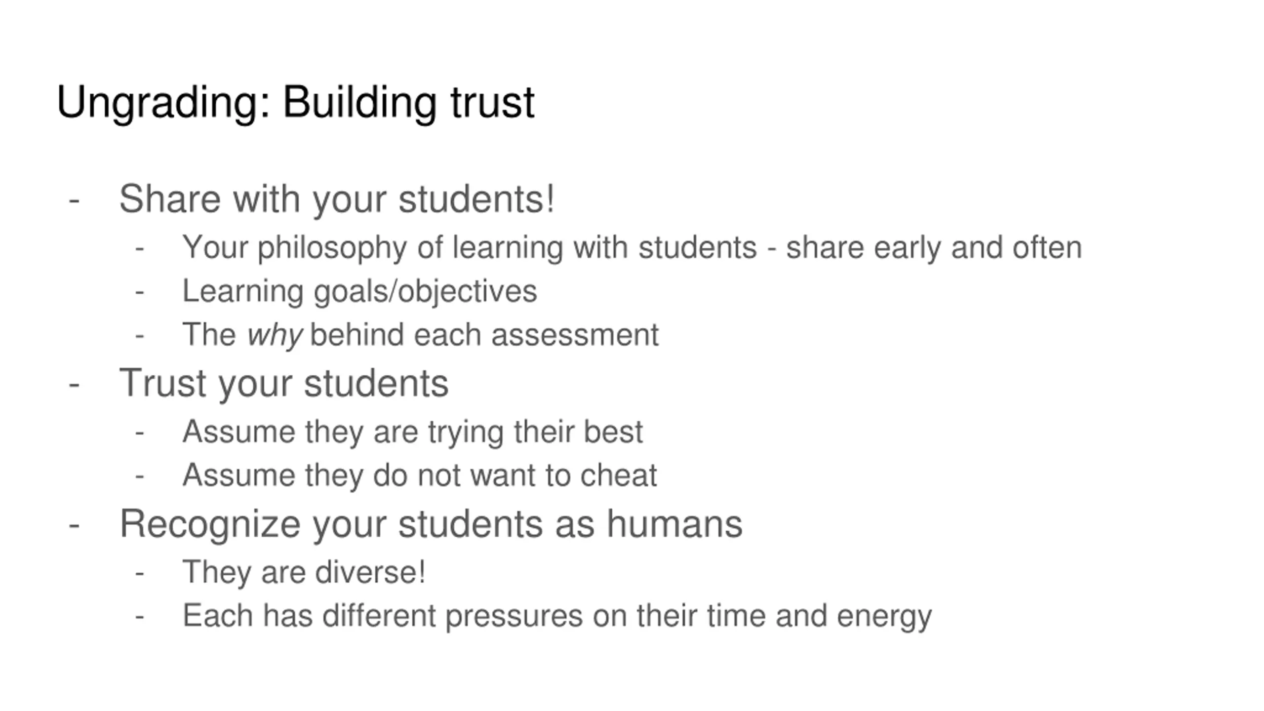 Ungrading: Building trust - Share with your students! - Your philosophy of learning with students - share early and often - Learning goals/objectives - The why behind each assessment Trust your students - Assume they are trying their best - Assume they do not want to cheat Recognize your students as humans - They are diverse! - Each has different pressures on their time and energy - -