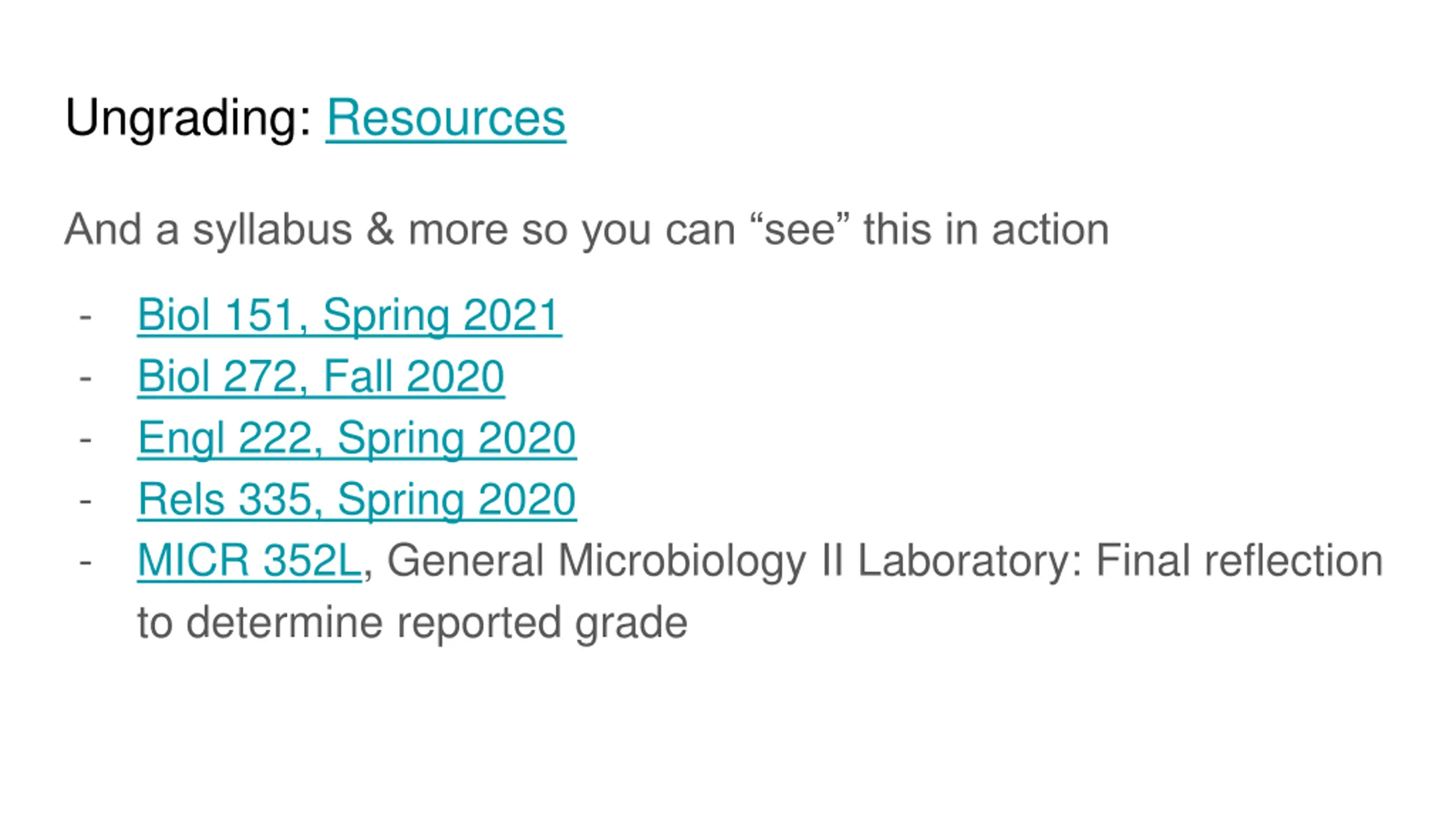 Ungrading: Resources And a syllabus & more so you can see this in action - - - - - Biol 151, Spring 2021 Biol 272, Fall 2020 Engl 222, Spring 2020 Rels 335, Spring 2020 MICR 352L, General Microbiology II Laboratory: Final reflection to determine reported grade