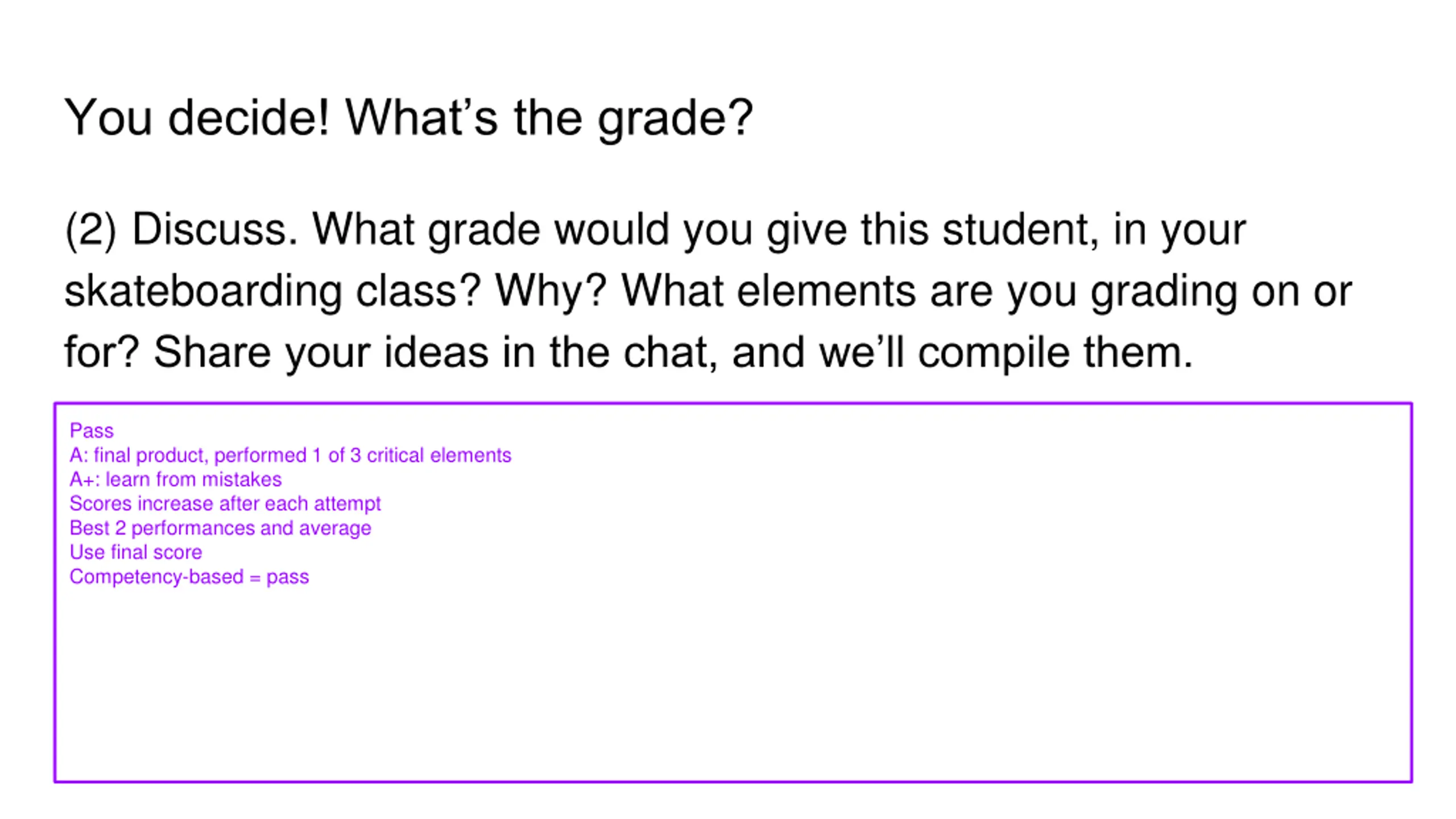 You decide! Whats the grade? (2) Discuss. What grade would you give this student, in your skateboarding class? Why? What elements are you grading on or for? Share your ideas in the chat, and we ll compile them. Pass A: final product, performed 1 of 3 critical elements A+: learn from mistakes Scores increase after each attempt Best 2 performances and average Use final score Competency-based = pass