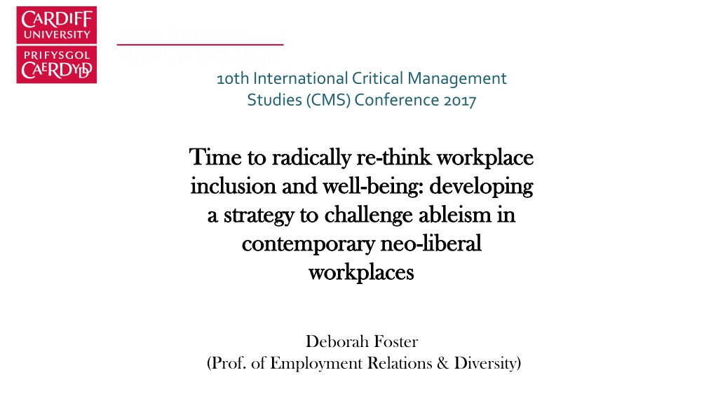 10th International Critical Management Studies (CMS) Conference 2017 Time to radically re Time to radically re- -think workplace inclusion and well inclusion and well- -being: developing a strategy to challenge ableism in a strategy to challenge ableism in contemporary neo contemporary neo- -liberal workplaces workplaces think workplace being: developing liberal Deborah Foster (Prof. of Employment Relations & Diversity)