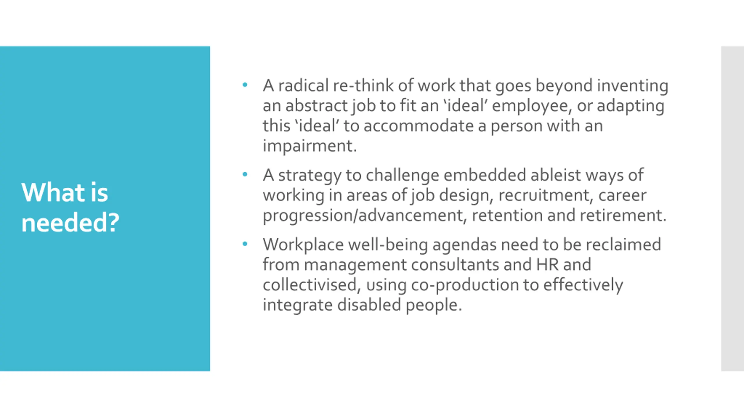 A radical re-think of work that goes beyond inventing an abstract job to fit an ideal employee, or adapting this ideal to accommodate a person with an impairment. A strategy to challenge embedded ableist ways of working in areas of job design, recruitment, career progression/advancement, retention and retirement. Workplace well-being agendas need to be reclaimed from management consultants and HR and collectivised, using co-production to effectively integrate disabled people. What is needed?