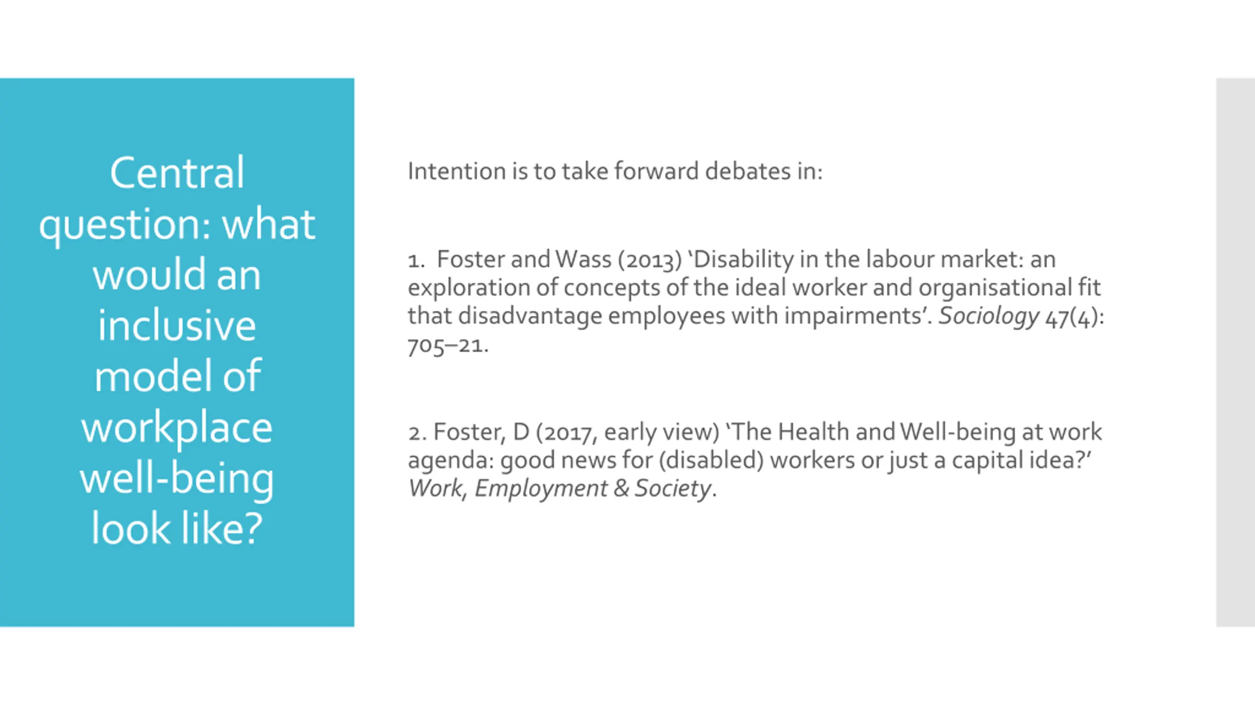 Central question: what would an inclusive model of workplace well-being look like? Intention is to take forward debates in: 1. Foster and Wass (2013) Disability in the labour market: an exploration of concepts of the ideal worker and organisational fit that disadvantage employees with impairments . Sociology 47(4): 705 21. 2. Foster, D (2017, early view) The Health and Well-being at work agenda: good news for (disabled) workers or just a capital idea? Work, Employment & Society.