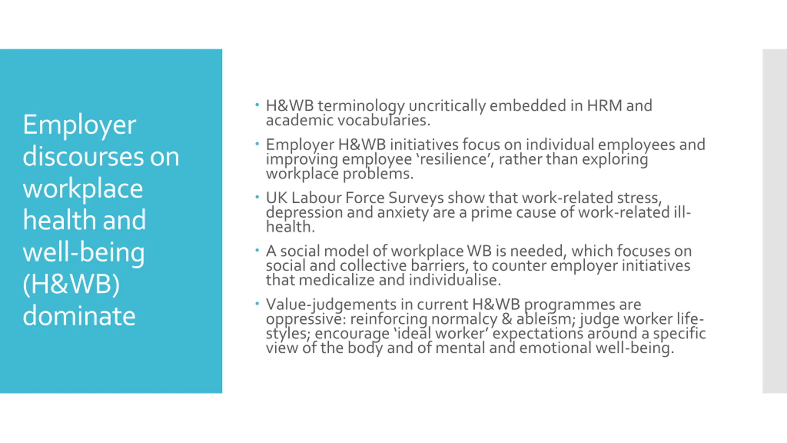 H&WB terminology uncritically embedded in HRM and academic vocabularies. Employer H&WB initiatives focus on individual employees and improving employee resilience , rather than exploring workplace problems. UK Labour Force Surveys show that work-related stress, depression and anxiety are a prime cause of work-related ill- health. A social model of workplace WB is needed, which focuses on social and collective barriers, to counter employer initiatives that medicalize and individualise. Value-judgements in current H&WB programmes are oppressive: reinforcing normalcy & ableism; judge worker life- styles; encourage ideal worker expectations around a specific view of the body and of mental and emotional well-being. Employer discourses on workplace health and well-being (H&WB) dominate