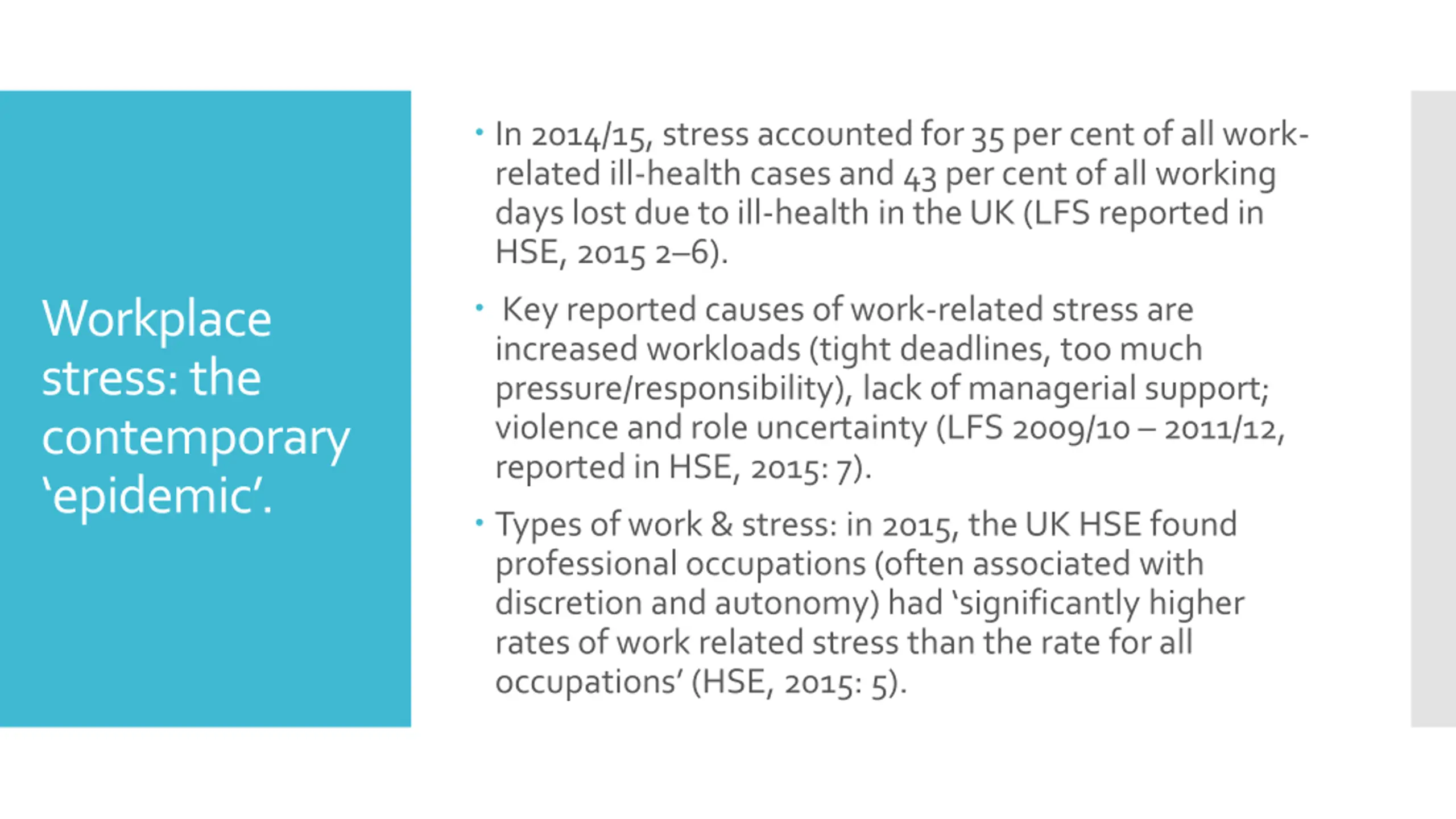 In 2014/15, stress accounted for 35 per cent of all work- related ill-health cases and 43 per cent of all working days lost due to ill-health in the UK (LFS reported in HSE, 2015 2 6). Key reported causes of work-related stress are increased workloads (tight deadlines, too much pressure/responsibility), lack of managerial support; violence and role uncertainty (LFS 2009/10 2011/12, reported in HSE, 2015: 7). Types of work & stress: in 2015, the UK HSE found professional occupations (often associated with discretion and autonomy) had significantly higher rates of work related stress than the rate for all occupations (HSE, 2015: 5). Workplace stress: the contemporary epidemic .