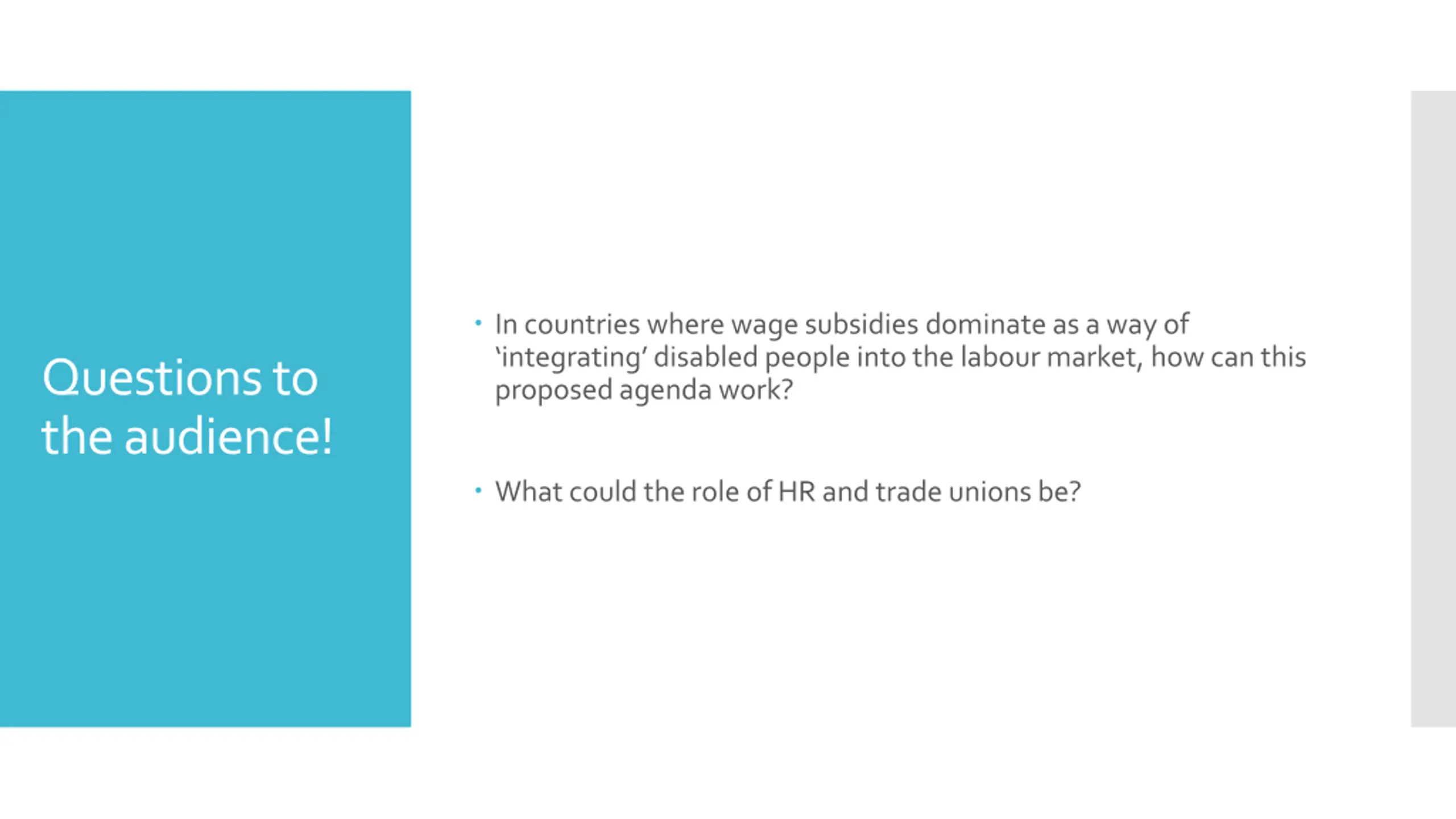 In countries where wage subsidies dominate as a way of integrating disabled people into the labour market, how can this proposed agenda work? Questions to the audience! What could the role of HR and trade unions be?