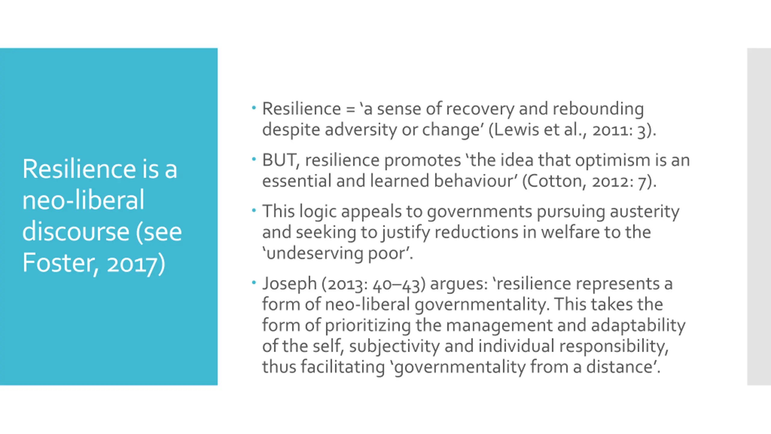 Resilience = a sense of recovery and rebounding despite adversity or change (Lewis et al., 2011: 3). BUT, resilience promotes the idea that optimism is an essential and learned behaviour (Cotton, 2012: 7). This logic appeals to governments pursuing austerity and seeking to justify reductions in welfare to the undeserving poor . Joseph (2013: 40 43) argues: resilience represents a form of neo-liberal governmentality. This takes the form of prioritizing the management and adaptability of the self, subjectivity and individual responsibility, thus facilitating governmentality from a distance . Resilience is a neo-liberal discourse (see Foster, 2017)