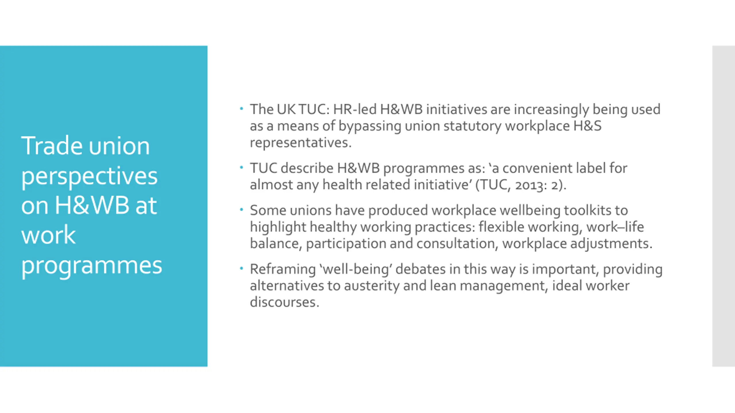 The UK TUC: HR-led H&WB initiatives are increasingly being used as a means of bypassing union statutory workplace H&S representatives. Trade union perspectives on H&WB at work programmes TUC describe H&WB programmes as: a convenient label for almost any health related initiative (TUC, 2013: 2). Some unions have produced workplace wellbeing toolkits to highlight healthy working practices: flexible working, work life balance, participation and consultation, workplace adjustments. Reframing well-being debates in this way is important, providing alternatives to austerity and lean management, ideal worker discourses.