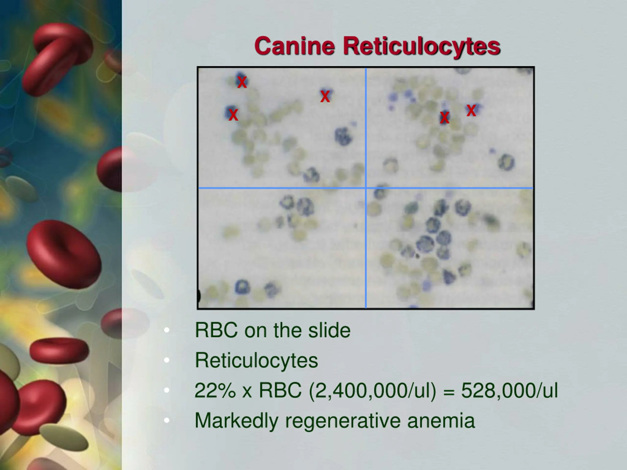 Canine Reticulocytes X X X X X RBC on the slide = 24 + 14 + 30 + 22 = 90 Reticulocytes = 20 20/90 = 22% 22% x RBC (2,400,000/ul) = 528,000/ul Markedly regenerative anemia