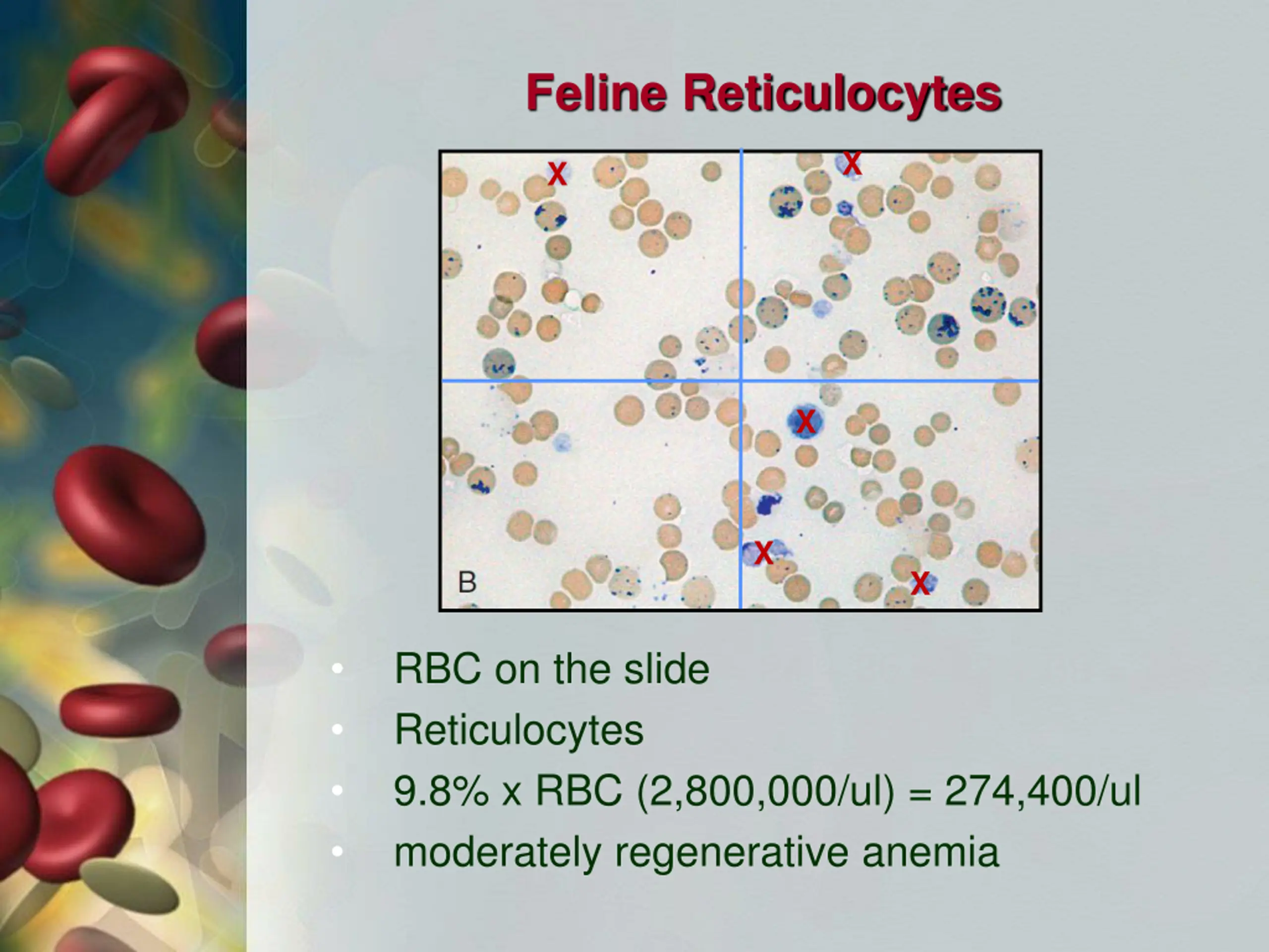 Feline Reticulocytes X X X X X RBC on the slide = 11 + 13 + 13 + 9 = 46 Reticulocytes = 4 4/46 = 8.7% 8.7% x RBC (1,000,000/ul) = 104,400/ul mildly regenerative anemia
