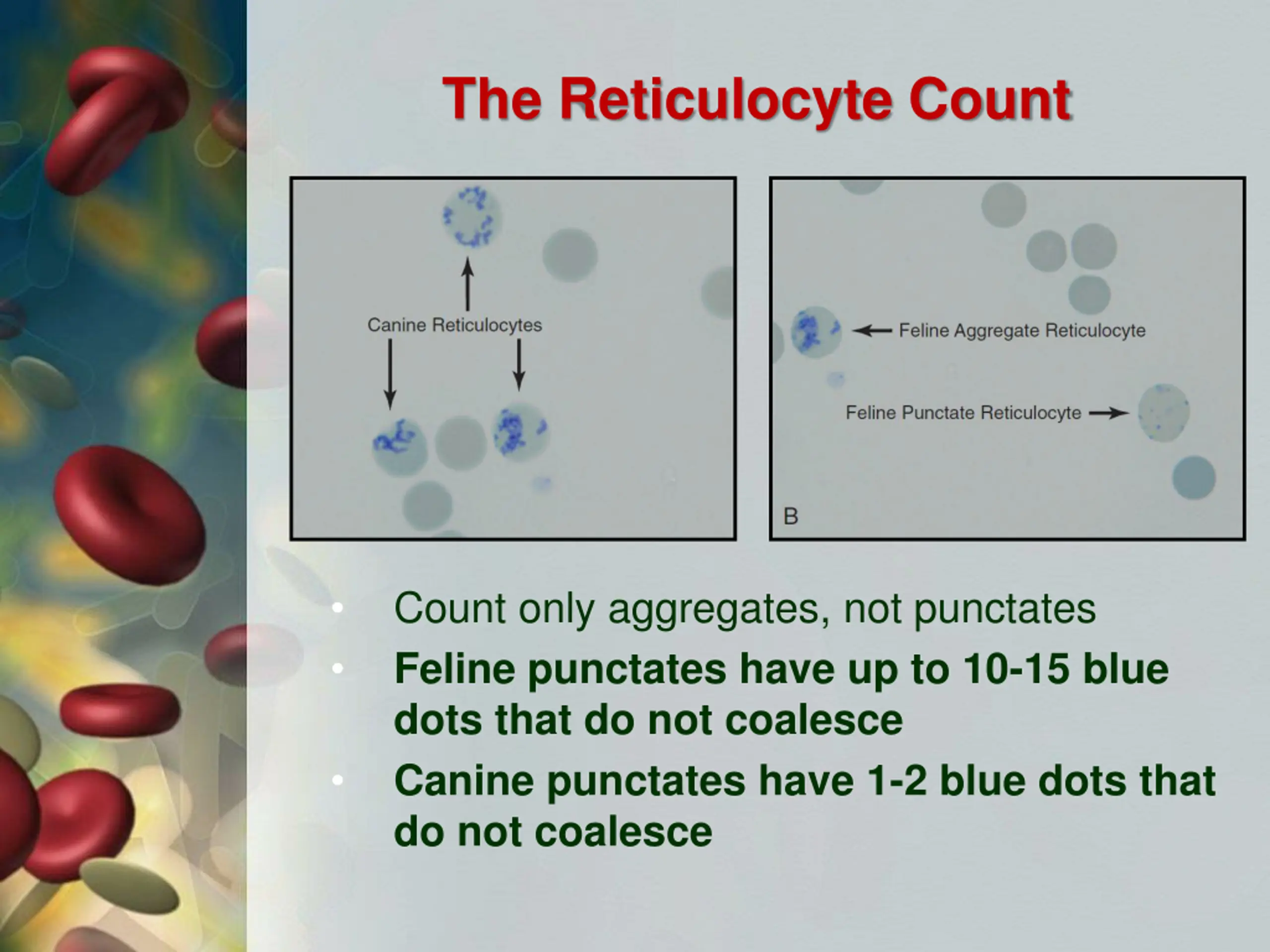 The Reticulocyte Count Count only aggregates, not punctates Feline punctates have up to 10-15 blue dots that do not coalesce Canine punctates have 1-2 blue dots that do not coalesce