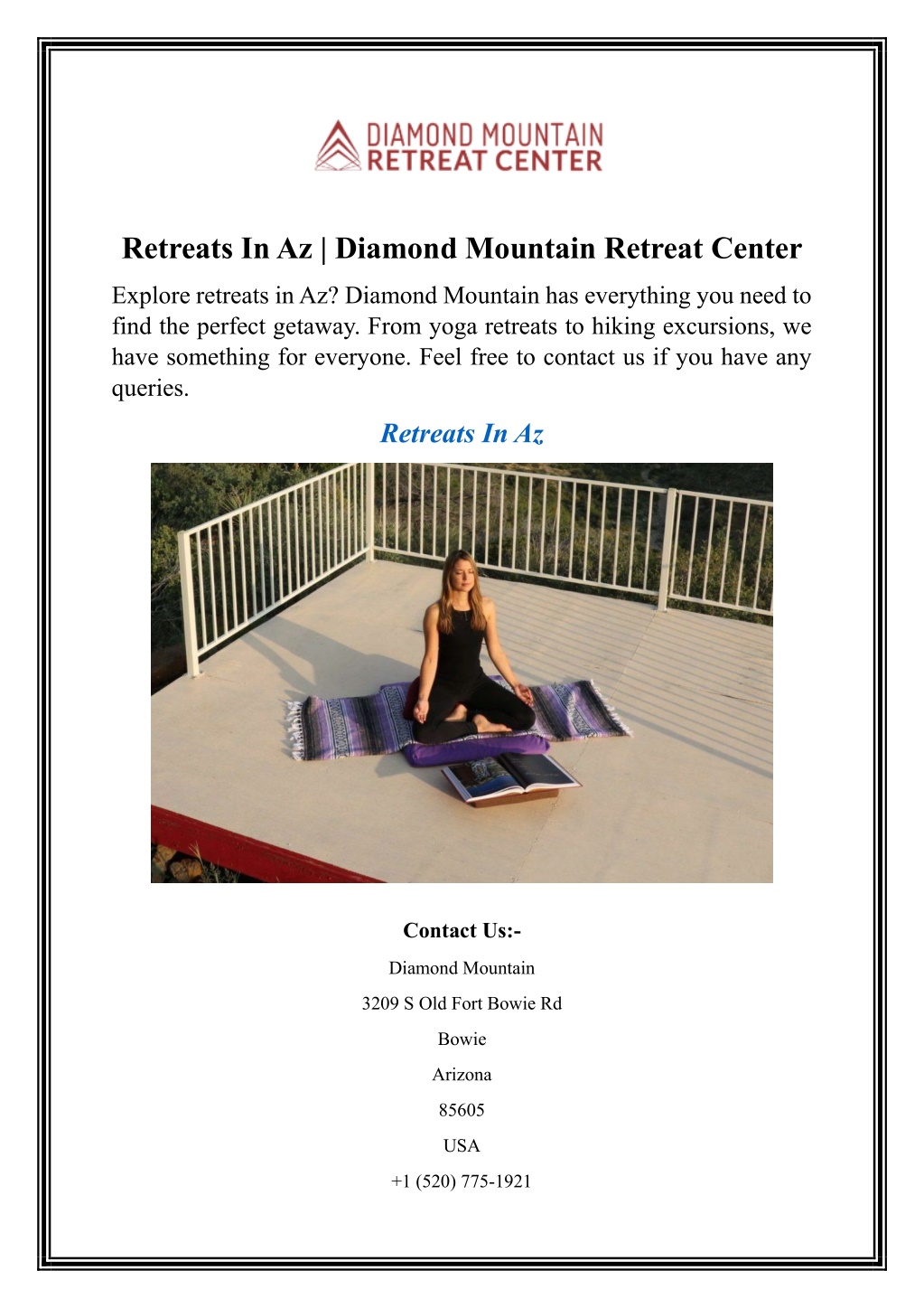 Retreats In Az | Diamond Mountain Retreat Center Explore retreats in Az? Diamond Mountain has everything you need to find the perfect getaway. From yoga retreats to hiking excursions, we have something for everyone. Feel free to contact us if you have any queries. Retreats In Az Contact Us:- Diamond Mountain 3209 S Old Fort Bowie Rd Bowie Arizona 85605 USA +1 (520) 775-1921