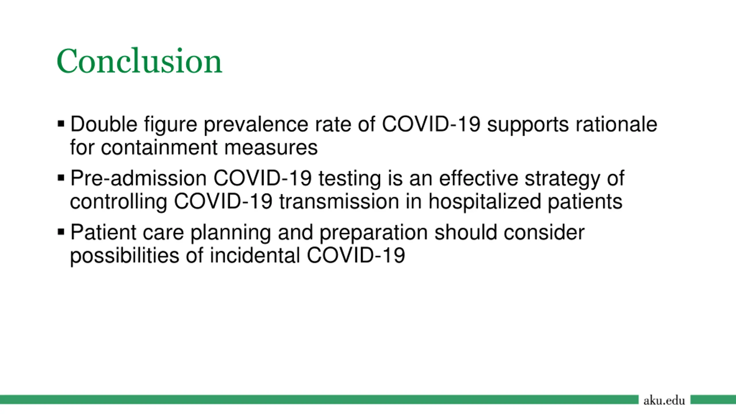 Conclusion Double figure prevalence rate of COVID-19 supports rationale for containment measures Pre-admission COVID-19 testing is an effective strategy of controlling COVID-19 transmission in hospitalized patients Patient care planning and preparation should consider possibilities of incidental COVID-19