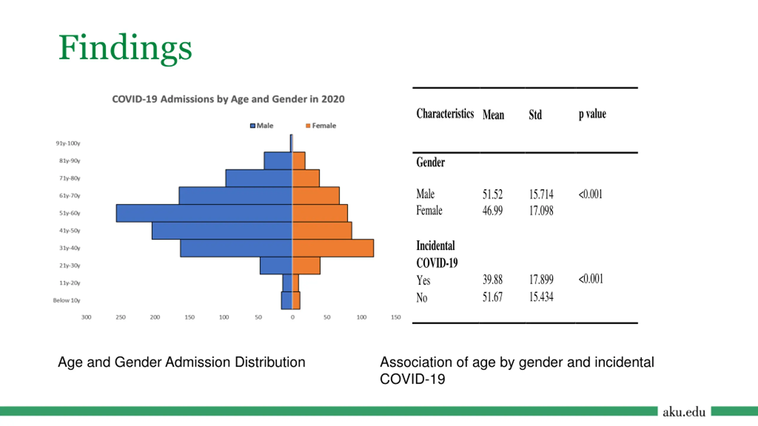 Findings p value Mean Std Characteristics Gender Male Female Incidental COVID-19 Yes No 15.714 17.098 17.899 15.434 51.52 46.99 39.88 51.67 <0.001 <0.001 Age and Gender Admission Distribution Association of age by gender and incidental COVID-19