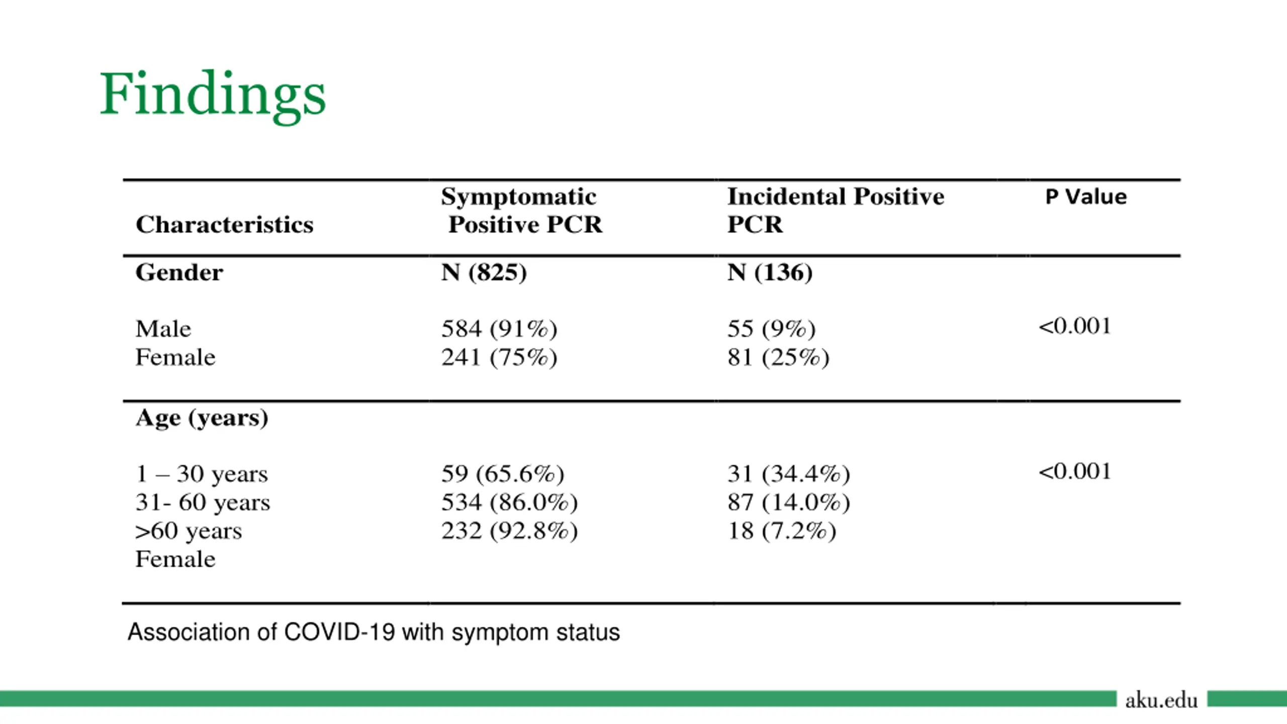 Findings P Value Symptomatic Positive PCR Incidental Positive PCR Characteristics Gender N (825) N (136) <0.001 Male Female Age (years) 584 (91%) 241 (75%) 59 (65.6%) 534 (86.0%) 232 (92.8%) 55 (9%) 81 (25%) <0.001 1 30 years 31- 60 years >60 years Female Association of COVID-19 with symptom status 31 (34.4%) 87 (14.0%) 18 (7.2%)