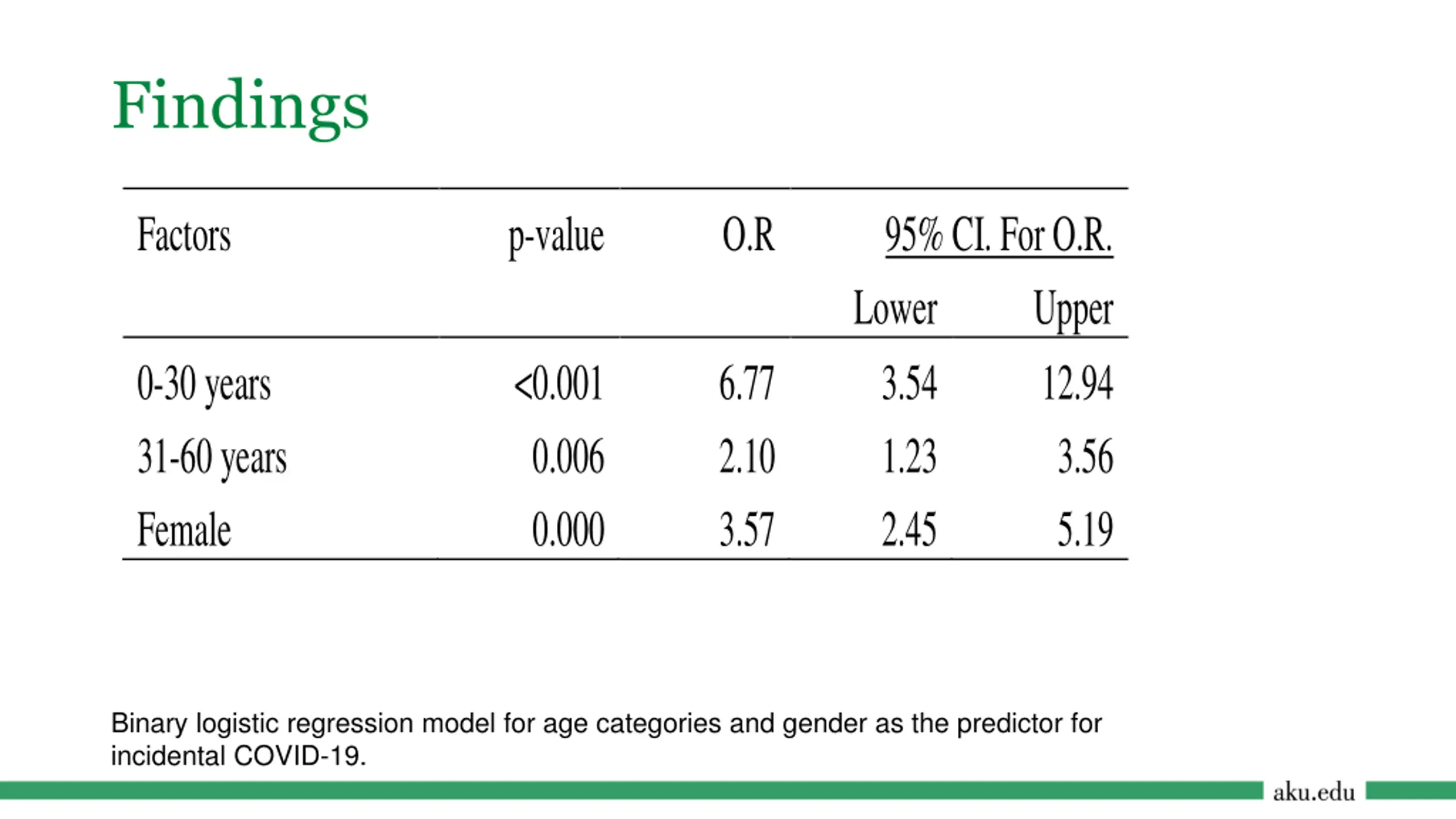 Findings Factors 0-30 years 31-60 years Female p-value O.R 95% CI. For O.R. Lower 3.54 1.23 2.45 Upper 12.94 3.56 5.19 <0.001 0.006 0.000 6.77 2.10 3.57 Binary logistic regression model for age categories and gender as the predictor for incidental COVID-19.