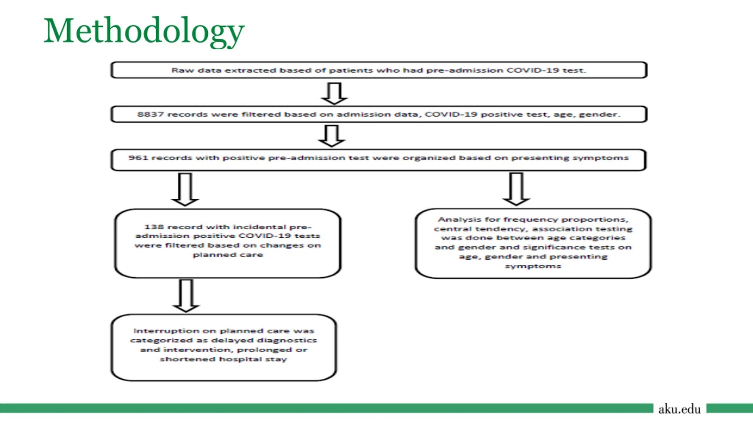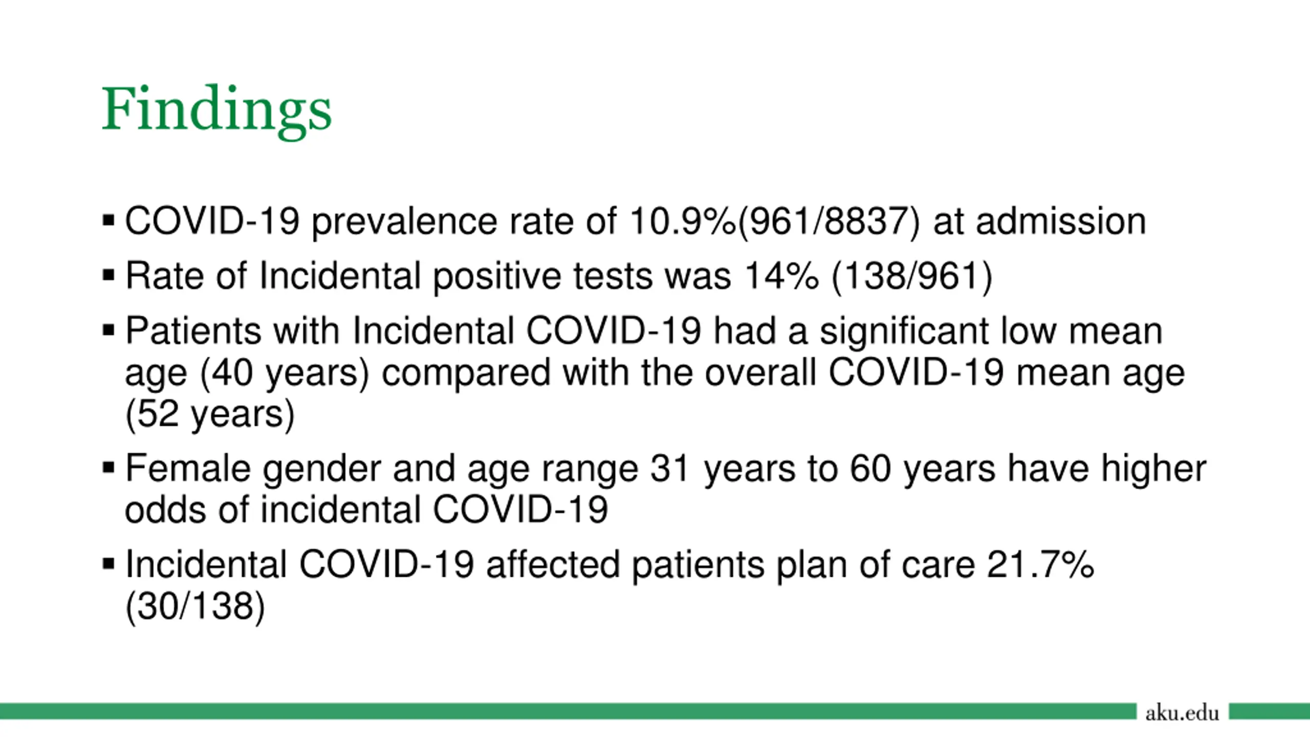 Findings COVID-19 prevalence rate of 10.9%(961/8837) at admission Rate of Incidental positive tests was 14% (138/961) Patients with Incidental COVID-19 had a significant low mean age (40 years) compared with the overall COVID-19 mean age (52 years) Female gender and age range 31 years to 60 years have higher odds of incidental COVID-19 Incidental COVID-19 affected patients plan of care 21.7% (30/138)