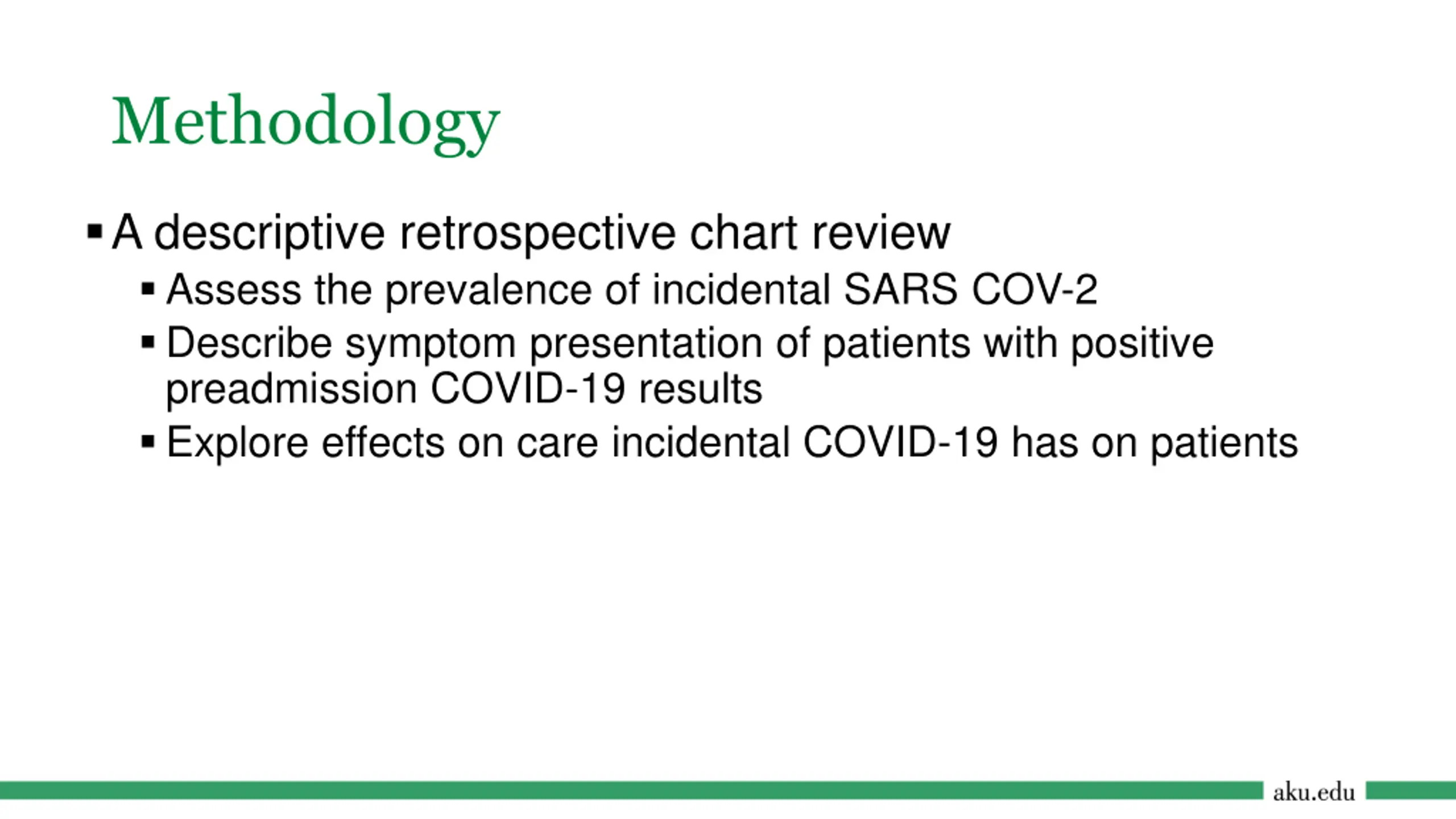 Methodology A descriptive retrospective chart review Assess the prevalence of incidental SARS COV-2 Describe symptom presentation of patients with positive preadmission COVID-19 results Explore effects on care incidental COVID-19 has on patients