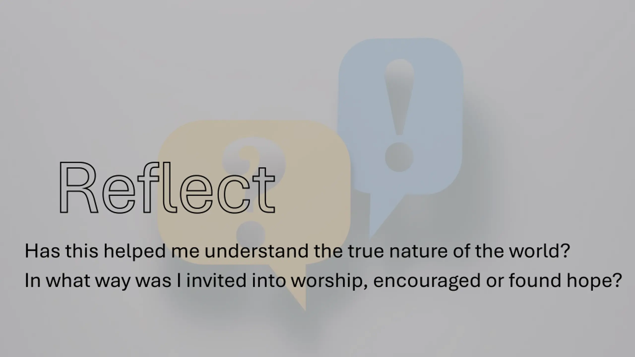 Reflect Has this helped me understand the true nature of the world? In what way was I invited into worship, encouraged or found hope?