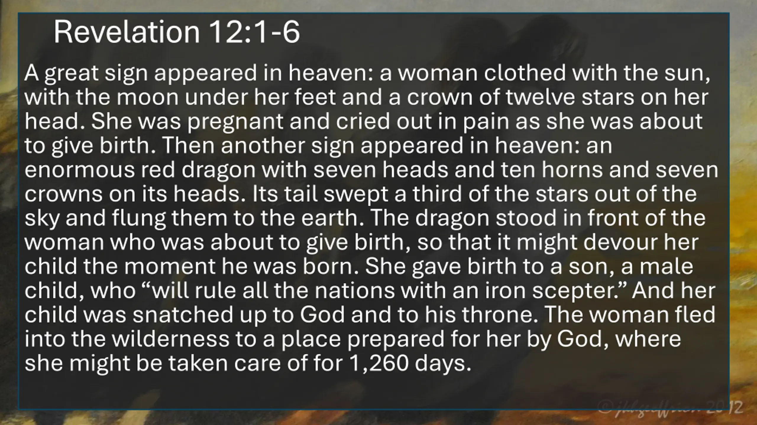 Revelation 12:1-6 A great sign appeared in heaven: a woman clothed with the sun, with the moon under her feet and a crown of twelve stars on her head. She was pregnant and cried out in pain as she was about to give birth. Then another sign appeared in heaven: an enormous red dragon with seven heads and ten horns and seven crowns on its heads. Its tail swept a third of the stars out of the sky and flung them to the earth. The dragon stood in front of the woman who was about to give birth, so that it might devour her child the moment he was born. She gave birth to a son, a male child, who will rule all the nations with an iron scepter. And her child was snatched up to God and to his throne. The woman fled into the wilderness to a place prepared for her by God, where she might be taken care of for 1,260 days.