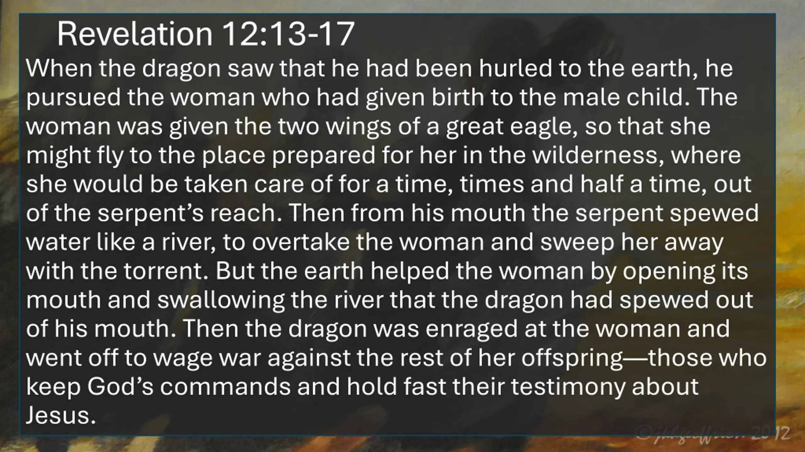 Revelation 12:13-17 When the dragon saw that he had been hurled to the earth, he pursued the woman who had given birth to the male child. The woman was given the two wings of a great eagle, so that she might fly to the place prepared for her in the wilderness, where she would be taken care of for a time, times and half a time, out of the serpent s reach. Then from his mouth the serpent spewed water like a river, to overtake the woman and sweep her away with the torrent. But the earth helped the woman by opening its mouth and swallowing the river that the dragon had spewed out of his mouth. Then the dragon was enraged at the woman and went off to wage war against the rest of her offspring those who keep God s commands and hold fast their testimony about Jesus.