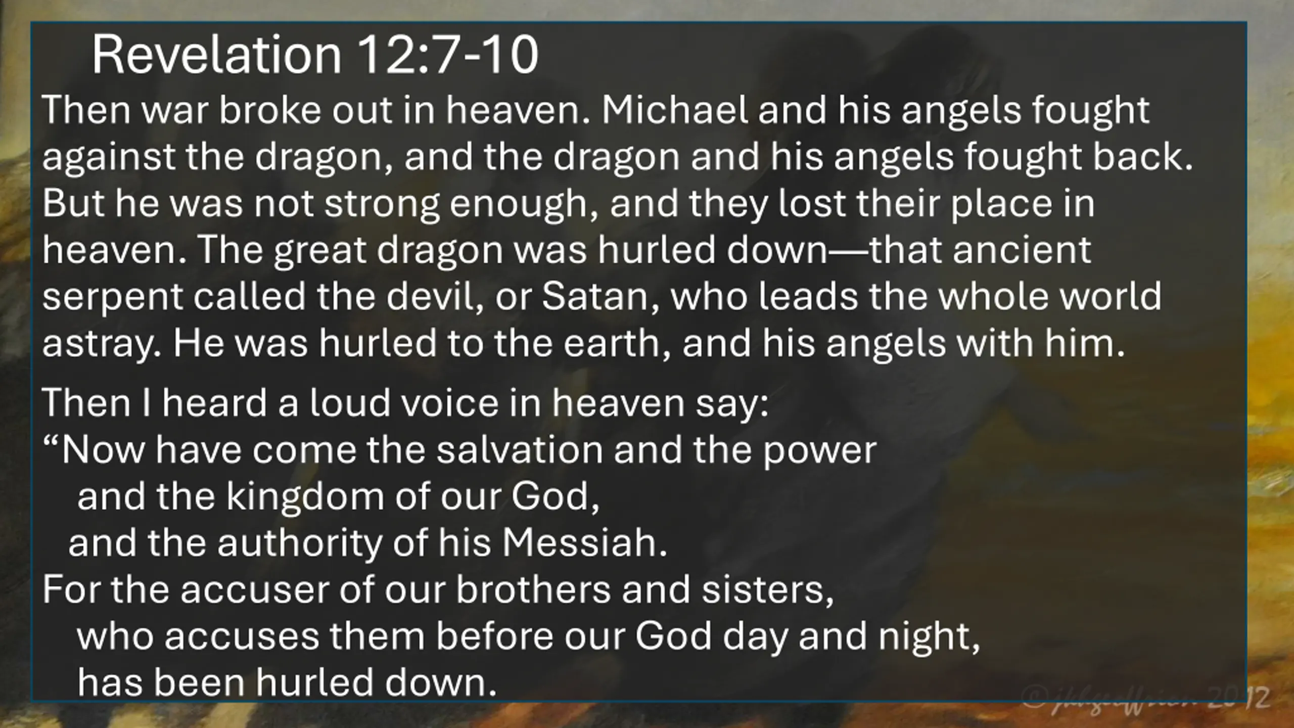 Revelation 12:7-10 Then war broke out in heaven. Michael and his angels fought against the dragon, and the dragon and his angels fought back. But he was not strong enough, and they lost their place in heaven. The great dragon was hurled down that ancient serpent called the devil, or Satan, who leads the whole world astray. He was hurled to the earth, and his angels with him. Then I heard a loud voice in heaven say: Now have come the salvation and the power and the kingdom of our God, and the authority of his Messiah. For the accuser of our brothers and sisters, who accuses them before our God day and night, has been hurled down.