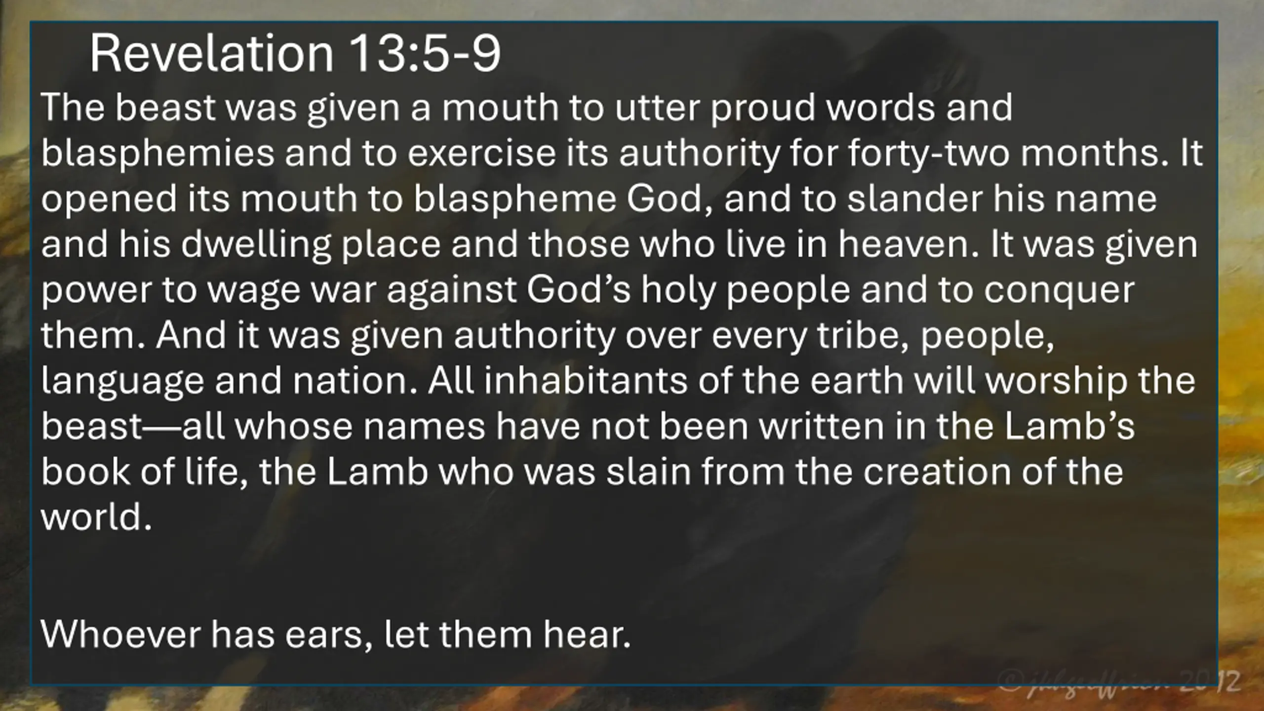 Revelation 13:5-9 The beast was given a mouth to utter proud words and blasphemies and to exercise its authority for forty-two months. It opened its mouth to blaspheme God, and to slander his name and his dwelling place and those who live in heaven. It was given power to wage war against God s holy people and to conquer them. And it was given authority over every tribe, people, language and nation. All inhabitants of the earth will worship the beast all whose names have not been written in the Lamb s book of life, the Lamb who was slain from the creation of the world. Whoever has ears, let them hear.