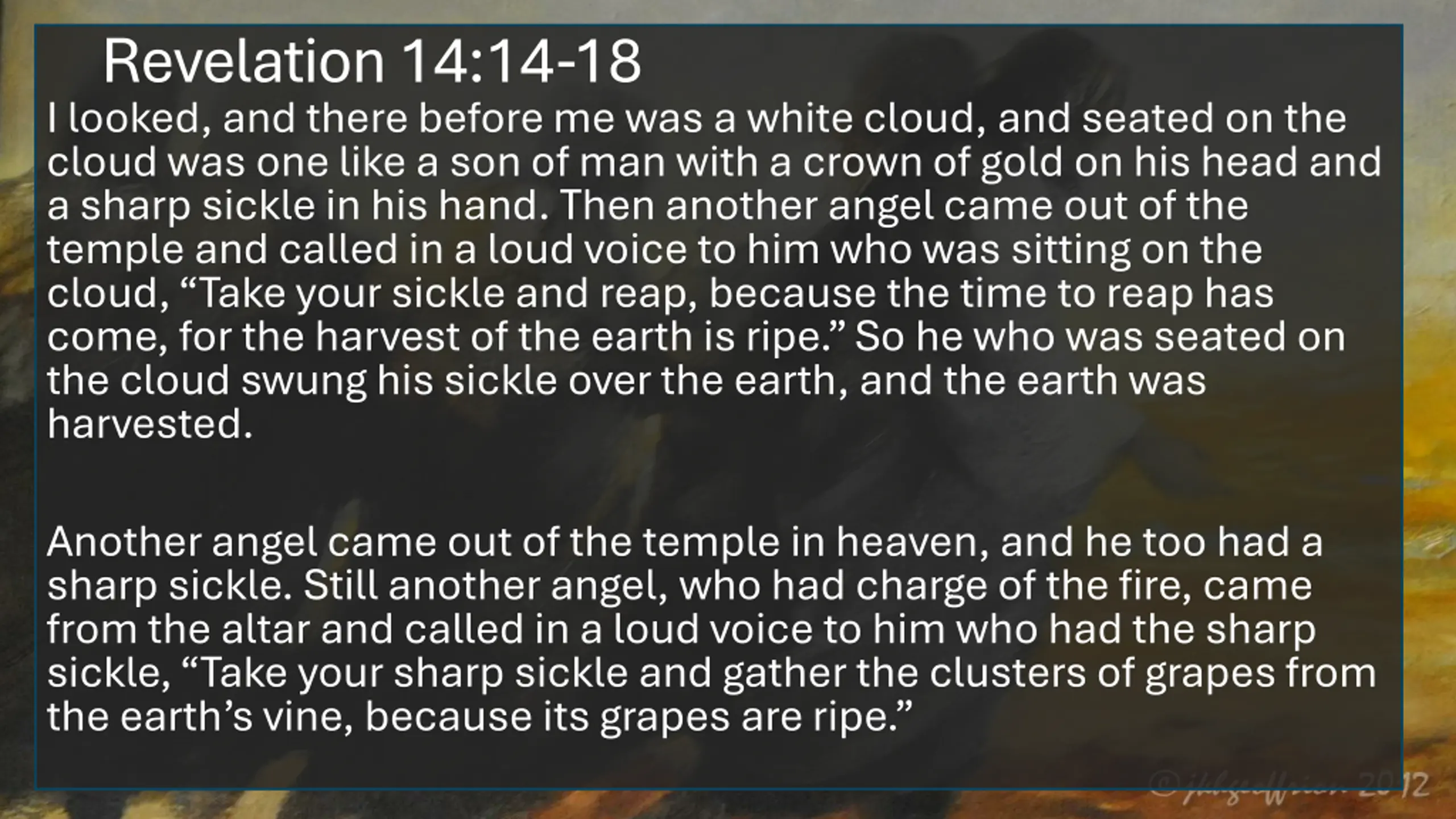 Revelation 14:14-18 I looked, and there before me was a white cloud, and seated on the cloud was one like a son of man with a crown of gold on his head and a sharp sickle in his hand. Then another angel came out of the temple and called in a loud voice to him who was sitting on the cloud, Take your sickle and reap, because the time to reap has come, for the harvest of the earth is ripe. So he who was seated on the cloud swung his sickle over the earth, and the earth was harvested. Another angel came out of the temple in heaven, and he too had a sharp sickle. Still another angel, who had charge of the fire, came from the altar and called in a loud voice to him who had the sharp sickle, Take your sharp sickle and gather the clusters of grapes from the earth s vine, because its grapes are ripe.