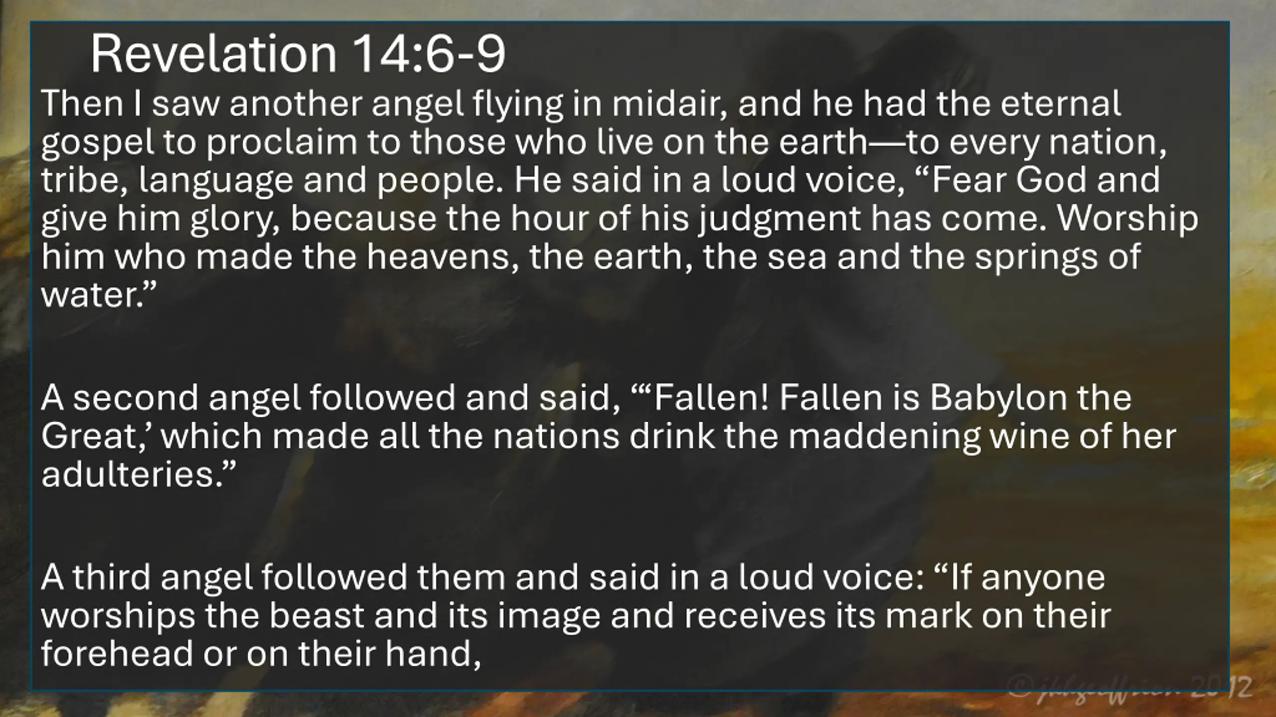Revelation 14:6-9 Then I saw another angel flying in midair, and he had the eternal gospel to proclaim to those who live on the earth to every nation, tribe, language and people. He said in a loud voice, Fear God and give him glory, because the hour of his judgment has come. Worship him who made the heavens, the earth, the sea and the springs of water. A second angel followed and said, Fallen! Fallen is Babylon the Great, which made all the nations drink the maddening wine of her adulteries. A third angel followed them and said in a loud voice: If anyone worships the beast and its image and receives its mark on their forehead or on their hand,