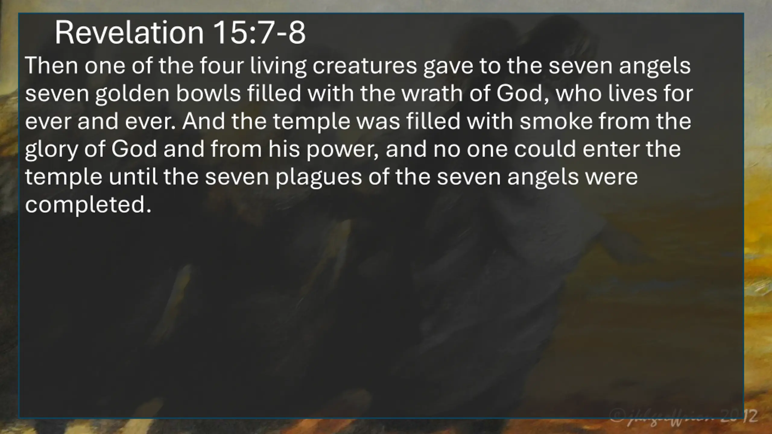 Revelation 15:7-8 Then one of the four living creatures gave to the seven angels seven golden bowls filled with the wrath of God, who lives for ever and ever. And the temple was filled with smoke from the glory of God and from his power, and no one could enter the temple until the seven plagues of the seven angels were completed.