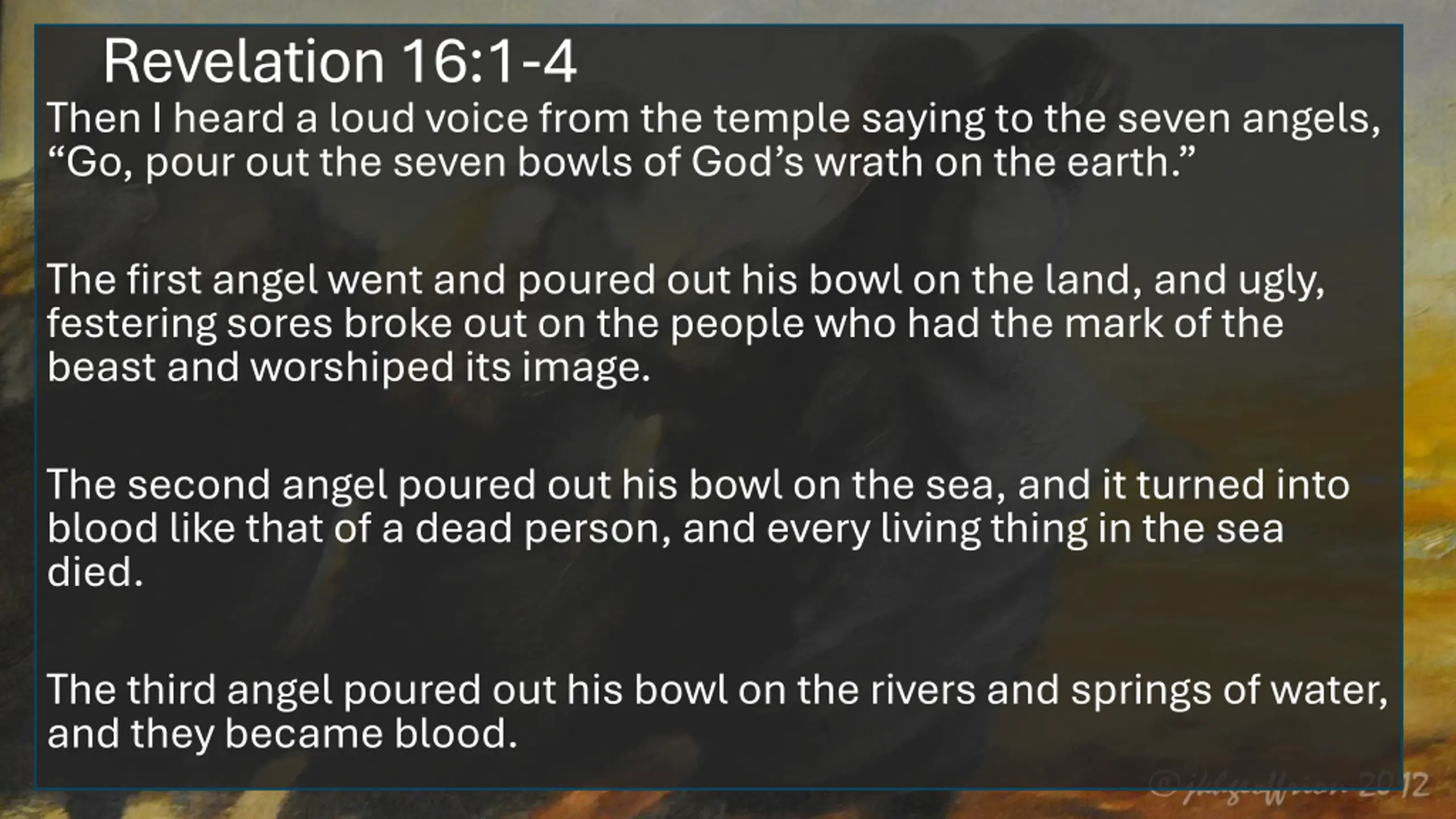 Revelation 16:1-4 Then I heard a loud voice from the temple saying to the seven angels, Go, pour out the seven bowls of God s wrath on the earth. The first angel went and poured out his bowl on the land, and ugly, festering sores broke out on the people who had the mark of the beast and worshiped its image. The second angel poured out his bowl on the sea, and it turned into blood like that of a dead person, and every living thing in the sea died. The third angel poured out his bowl on the rivers and springs of water, and they became blood.