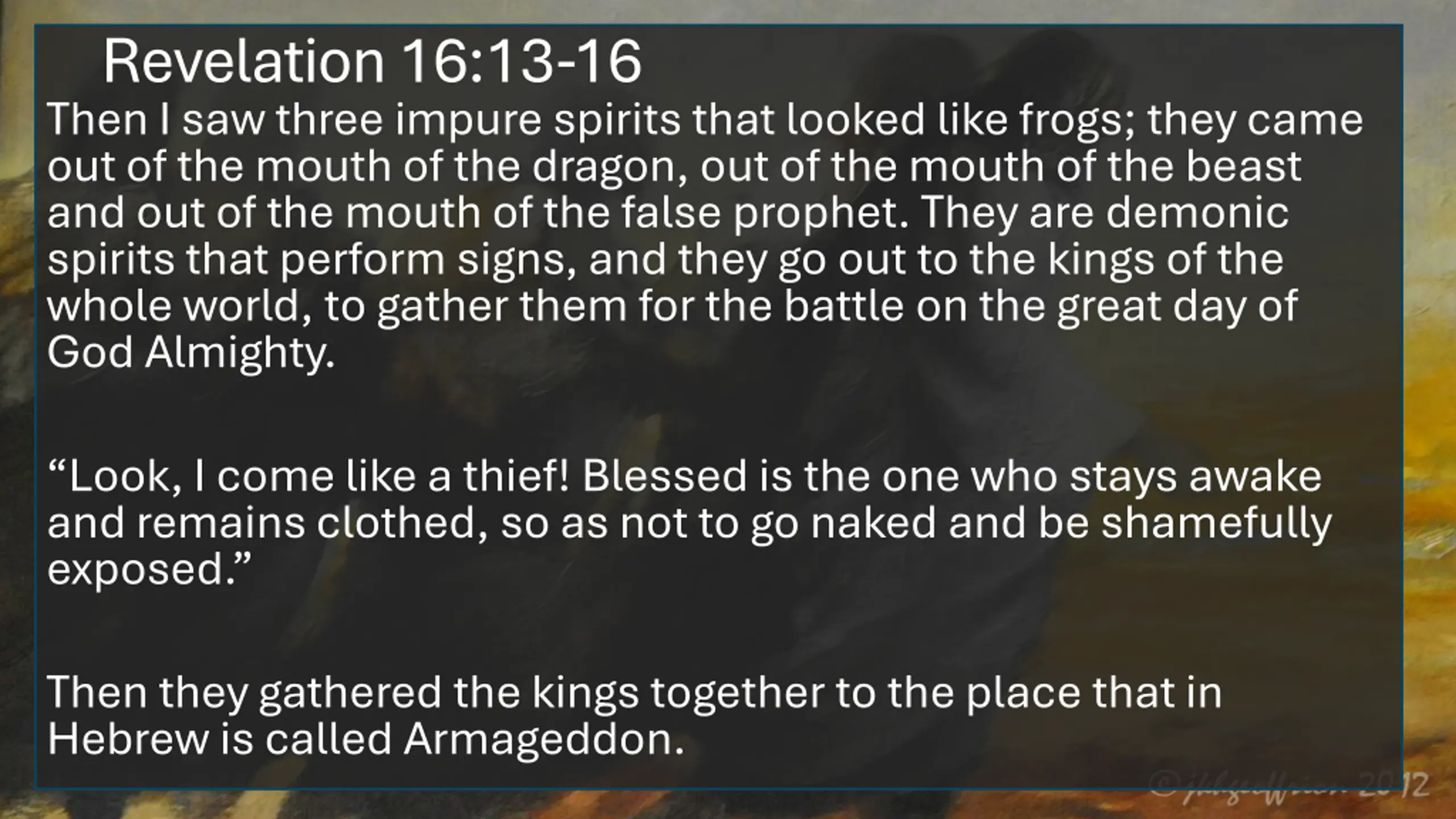 Revelation 16:13-16 Then I saw three impure spirits that looked like frogs; they came out of the mouth of the dragon, out of the mouth of the beast and out of the mouth of the false prophet. They are demonic spirits that perform signs, and they go out to the kings of the whole world, to gather them for the battle on the great day of God Almighty. Look, I come like a thief! Blessed is the one who stays awake and remains clothed, so as not to go naked and be shamefully exposed. Then they gathered the kings together to the place that in Hebrew is called Armageddon.