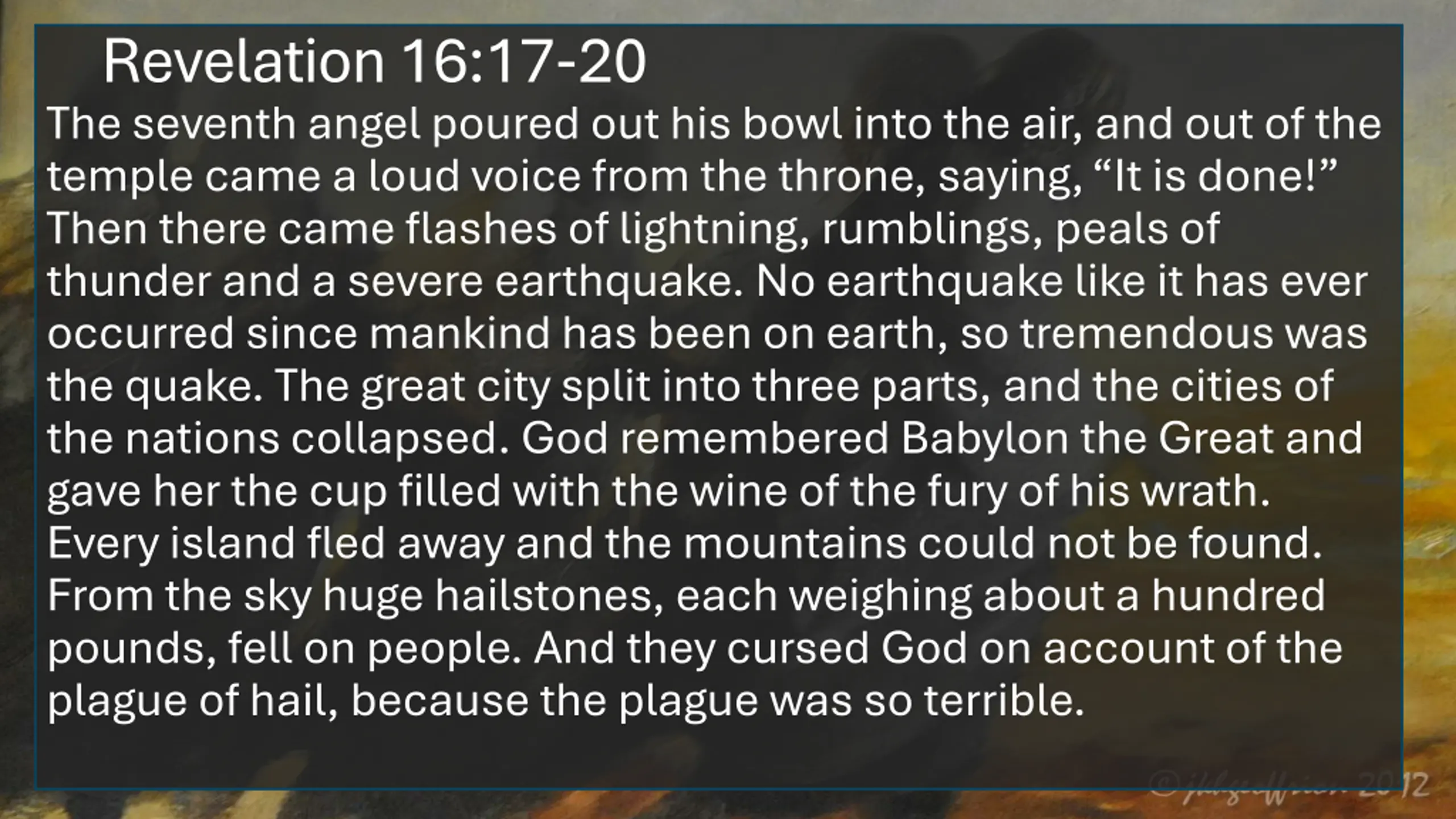Revelation 16:17-20 The seventh angel poured out his bowl into the air, and out of the temple came a loud voice from the throne, saying, It is done! Then there came flashes of lightning, rumblings, peals of thunder and a severe earthquake. No earthquake like it has ever occurred since mankind has been on earth, so tremendous was the quake. The great city split into three parts, and the cities of the nations collapsed. God remembered Babylon the Great and gave her the cup filled with the wine of the fury of his wrath. Every island fled away and the mountains could not be found. From the sky huge hailstones, each weighing about a hundred pounds, fell on people. And they cursed God on account of the plague of hail, because the plague was so terrible.