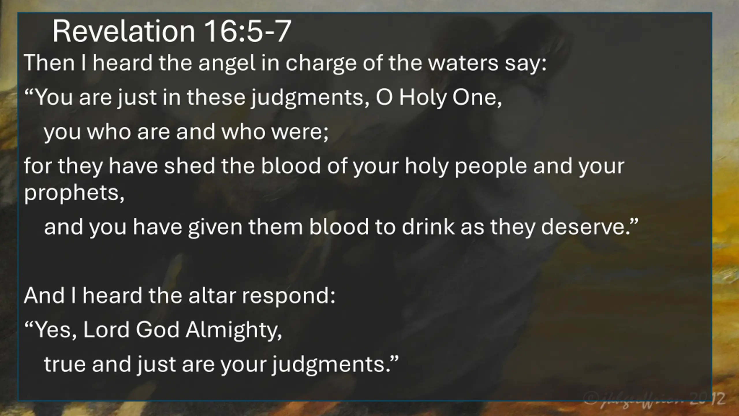 Revelation 16:5-7 Then I heard the angel in charge of the waters say: You are just in these judgments, O Holy One, you who are and who were; for they have shed the blood of your holy people and your prophets, and you have given them blood to drink as they deserve. And I heard the altar respond: Yes, Lord God Almighty, true and just are your judgments.