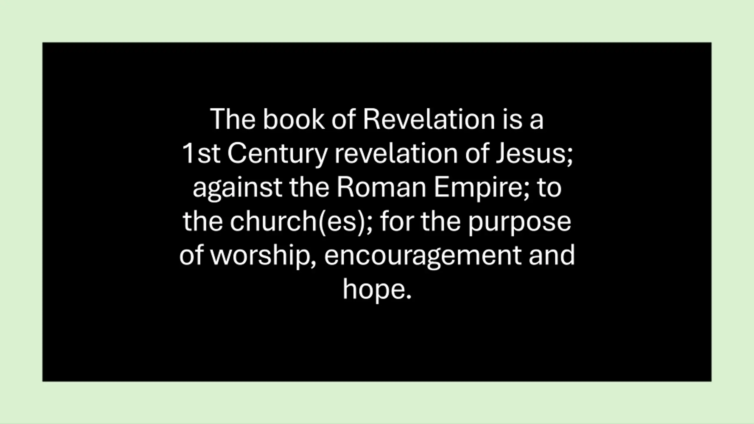 The book of Revelation is a 1st Century revelation of Jesus; against the Roman Empire; to the church(es); for the purpose of worship, encouragement and hope.