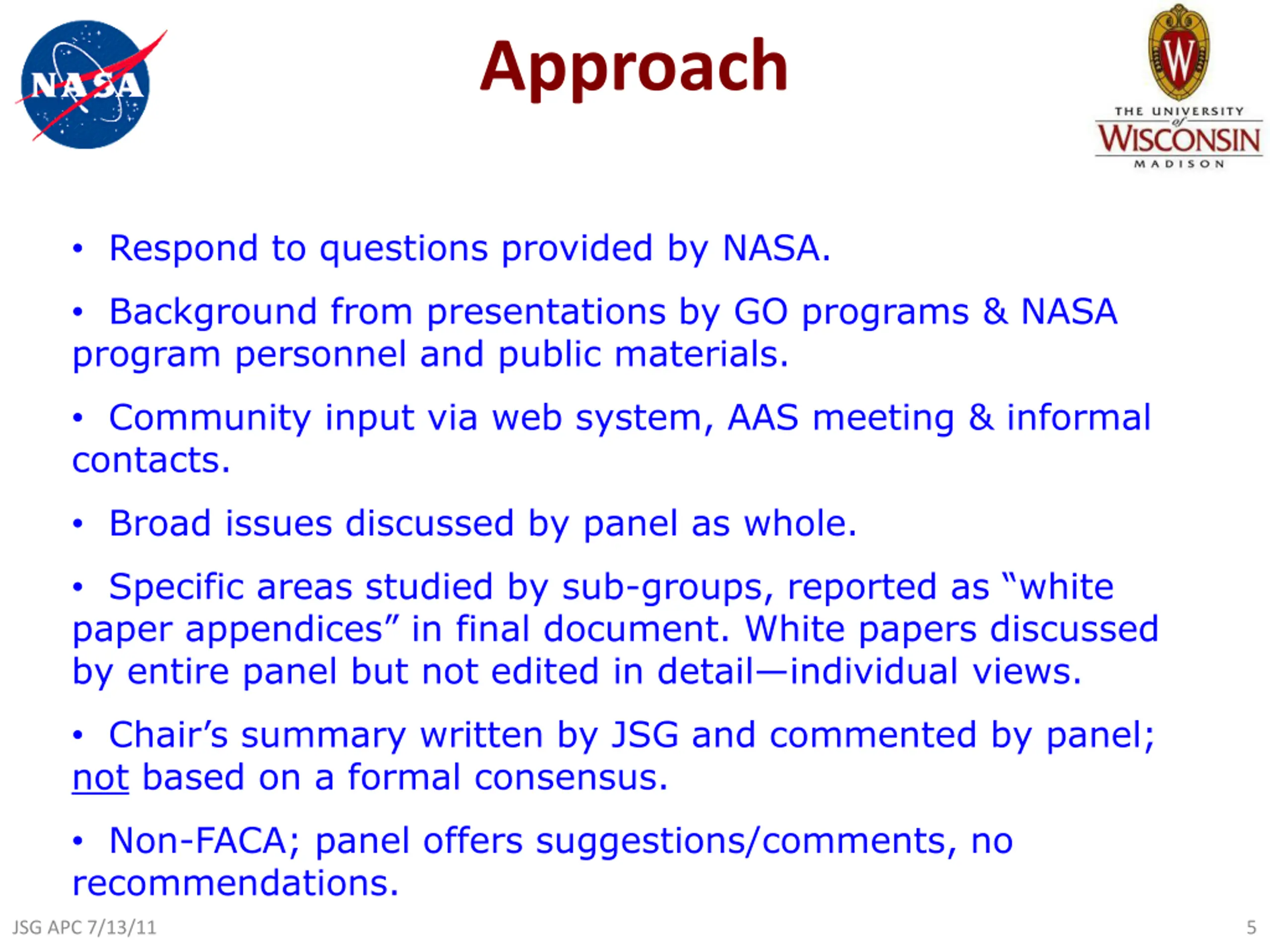 Approach Respond to questions provided by NASA. Background from presentations by GO programs & NASA program personnel and public materials. Community input via web system, AAS meeting & informal contacts. Broad issues discussed by panel as whole. Specific areas studied by sub-groups, reported as white paper appendices in final document. White papers discussed by entire panel but not edited in detail individual views. Chair s summary written by JSG and commented by panel; not based on a formal consensus. Non-FACA; panel offers suggestions/comments, no recommendations. JSG APC 7/13/11 5