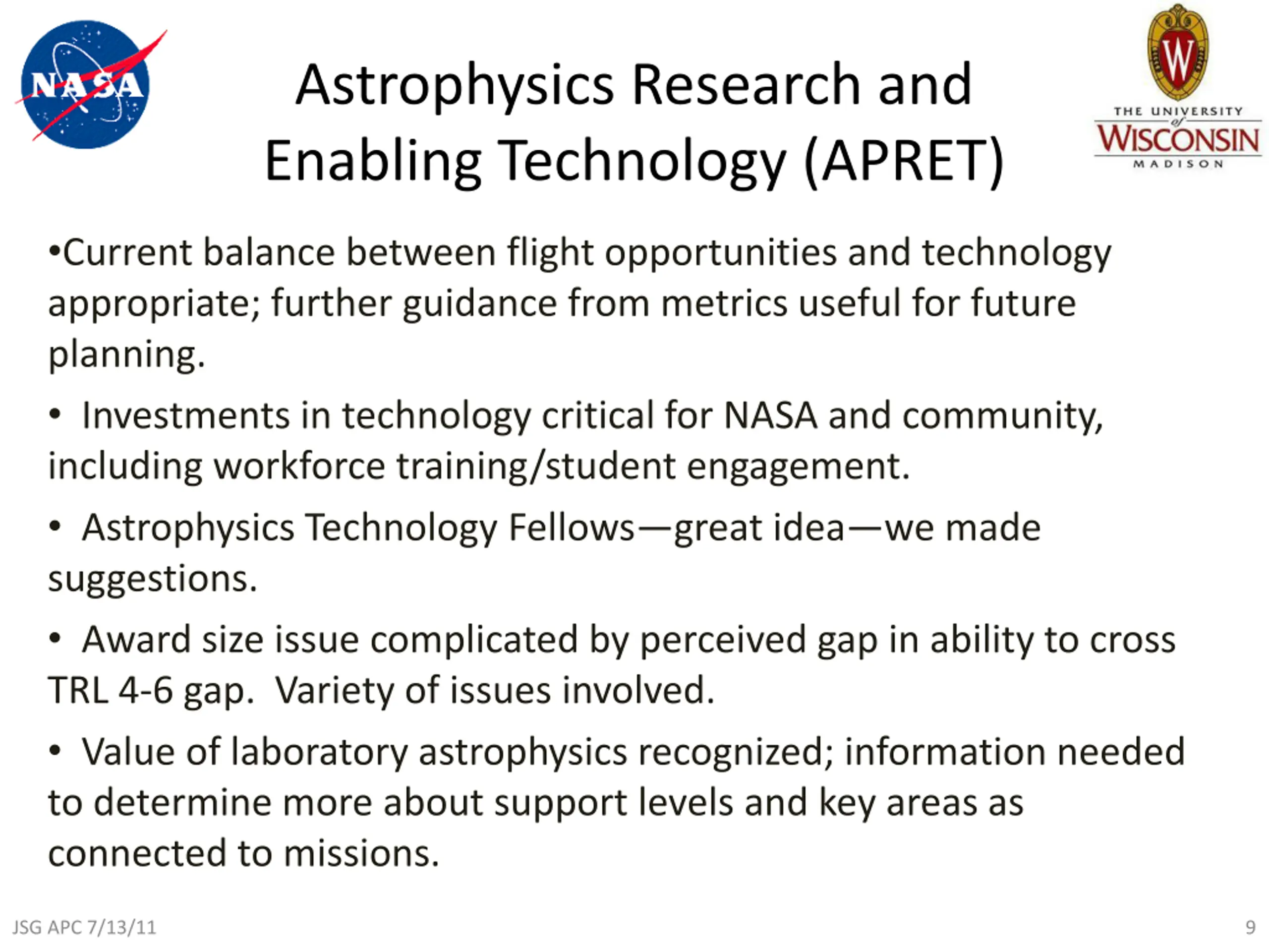 Astrophysics Research and Enabling Technology (APRET) Current balance between flight opportunities and technology appropriate; further guidance from metrics useful for future planning. Investments in technology critical for NASA and community, including workforce training/student engagement. Astrophysics Technology Fellows great idea we made suggestions. Award size issue complicated by perceived gap in ability to cross TRL 4-6 gap. Variety of issues involved. Value of laboratory astrophysics recognized; information needed to determine more about support levels and key areas as connected to missions. JSG APC 7/13/11 9
