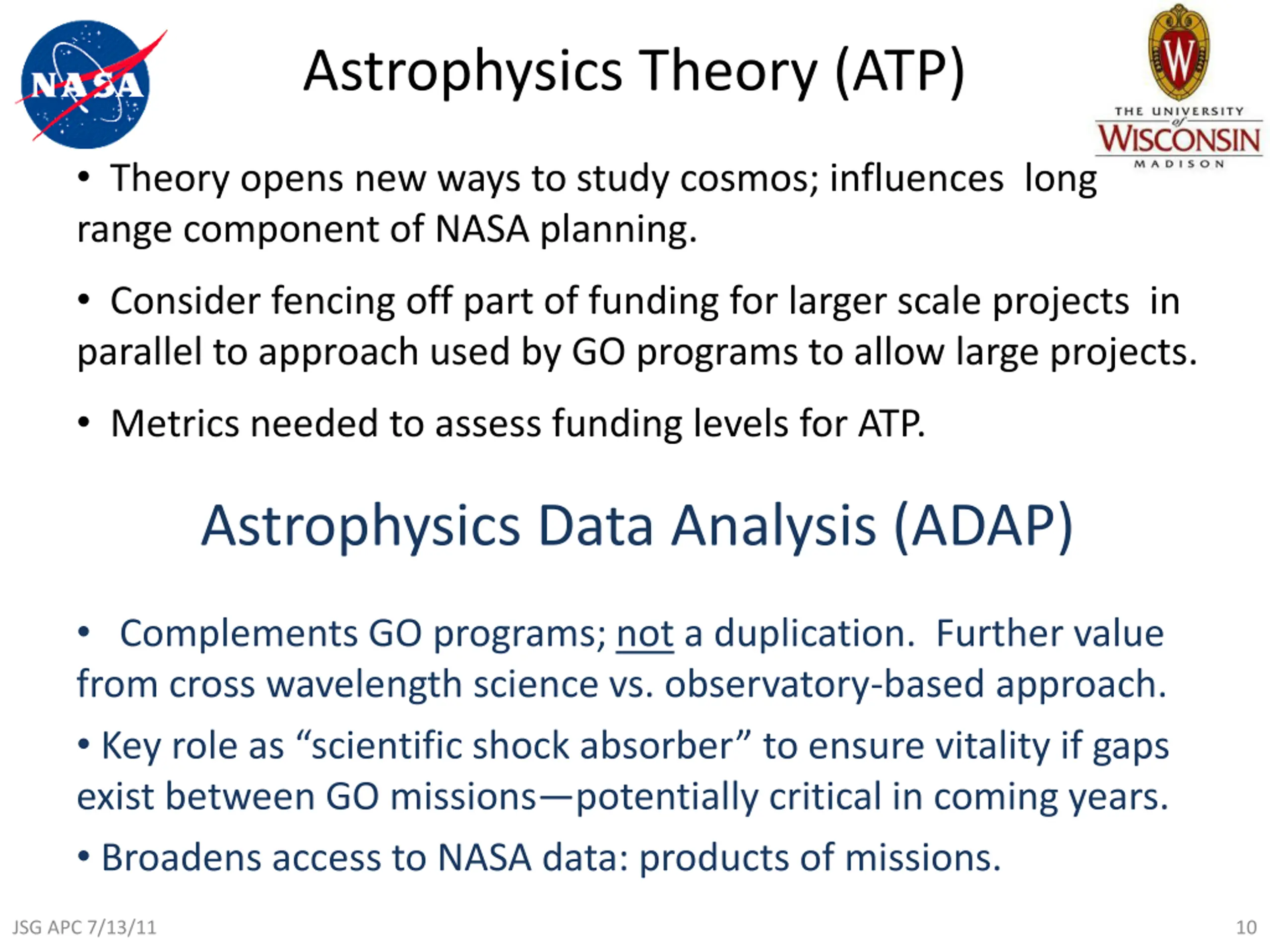 Astrophysics Theory (ATP) Theory opens new ways to study cosmos; influences long range component of NASA planning. Consider fencing off part of funding for larger scale projects in parallel to approach used by GO programs to allow large projects. Metrics needed to assess funding levels for ATP. Astrophysics Data Analysis (ADAP) Complements GO programs; not a duplication. Further value from cross wavelength science vs. observatory-based approach. Key role as scientific shock absorber to ensure vitality if gaps exist between GO missions potentially critical in coming years. Broadens access to NASA data: products of missions. JSG APC 7/13/11 10